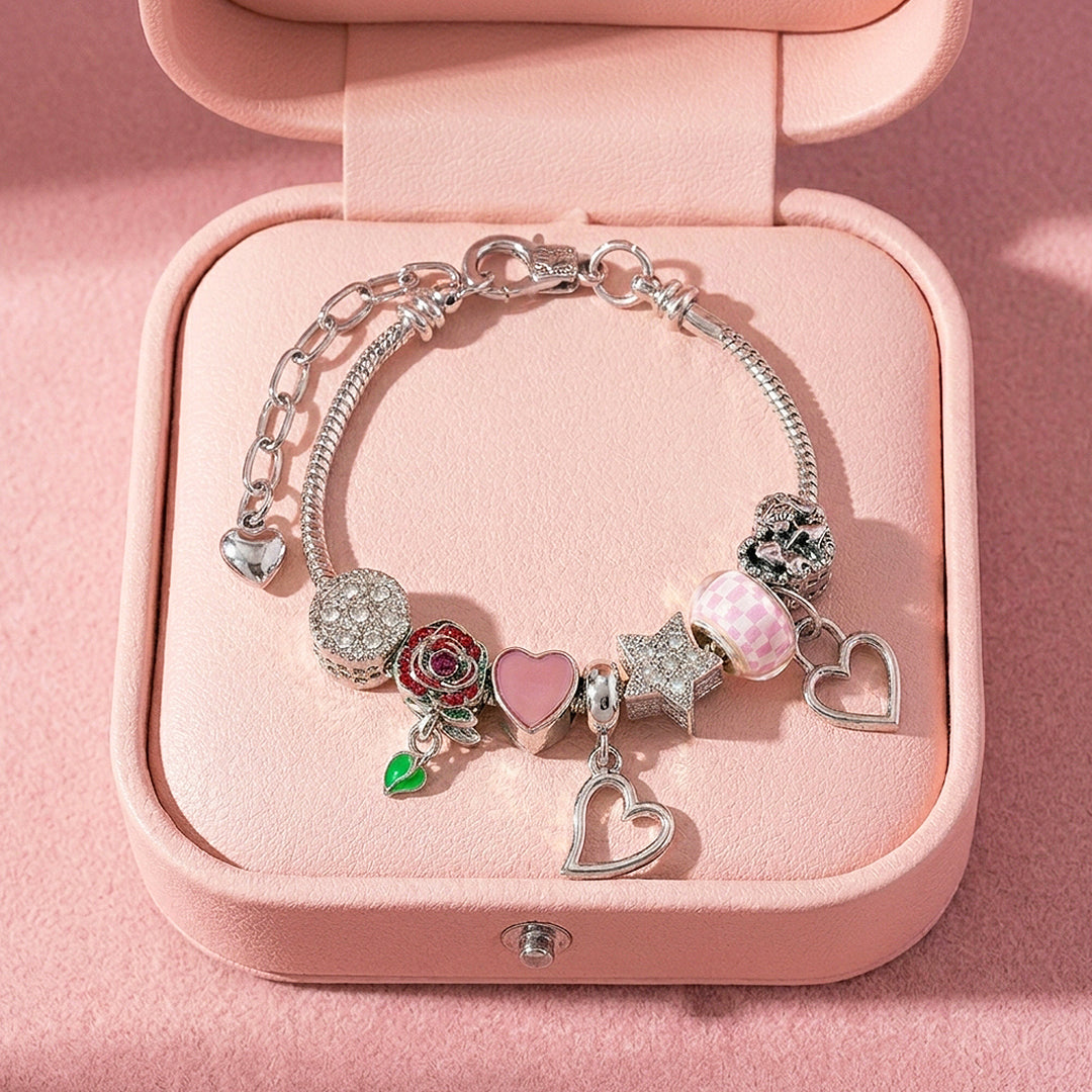 - Red Rose Enamel Charm: A hand-detailed red rose with green enamel leaf drop anchors the bracelet's romantic theme, adding depth and colour contrast against the silver tone