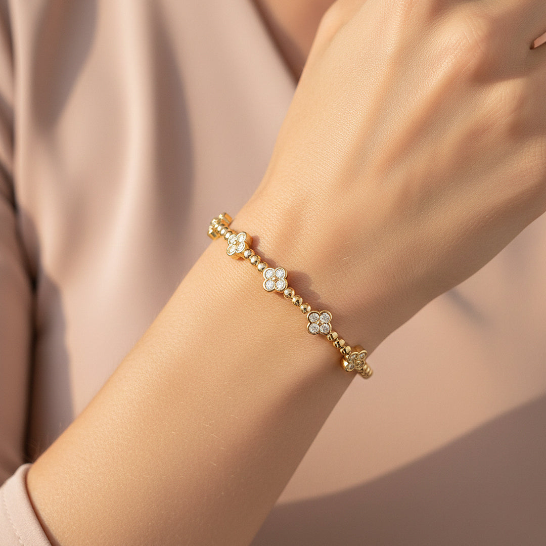 Finished with five layers of premium electroplating, this piece delivers a mirror-like shine that lasts, making it ideal for both everyday wear and special occasions. Whether worn alone or layered, this bangle adds a graceful, meaningful sparkle to any look.
