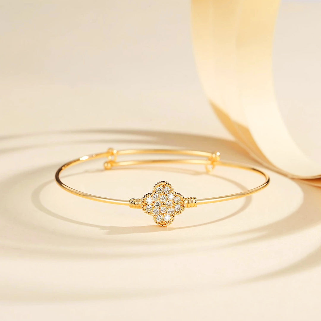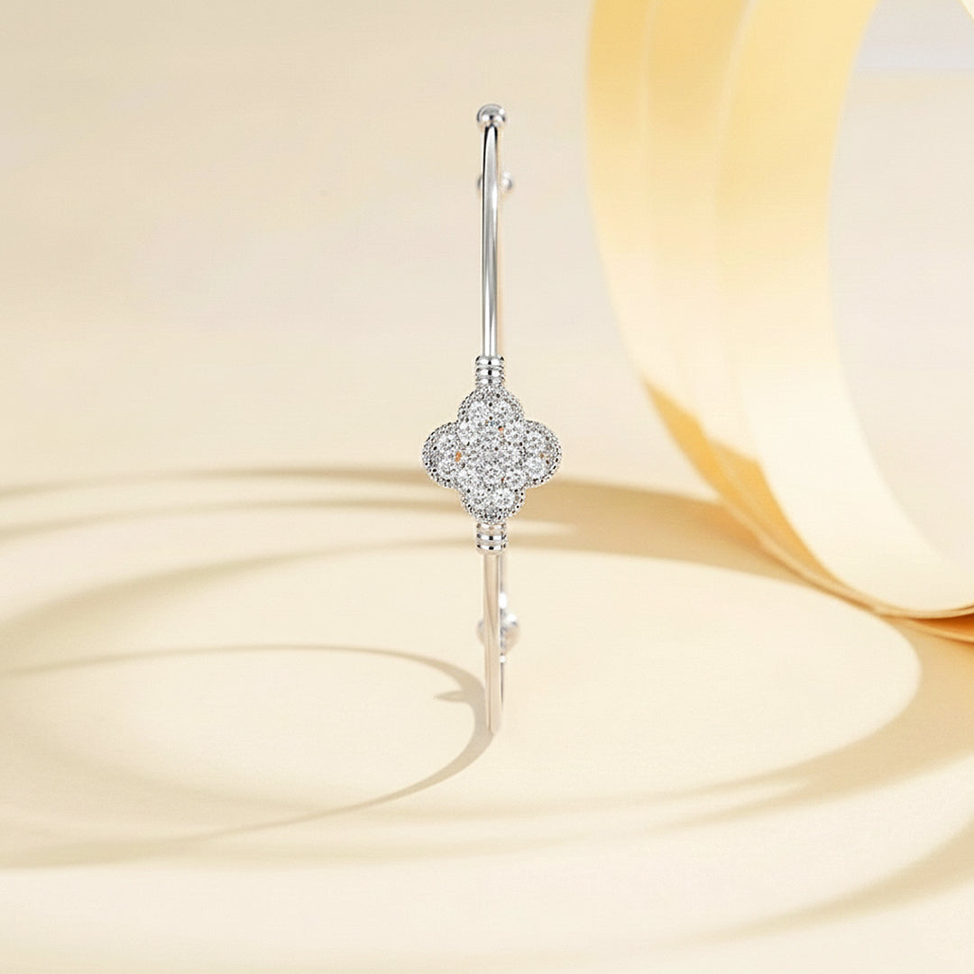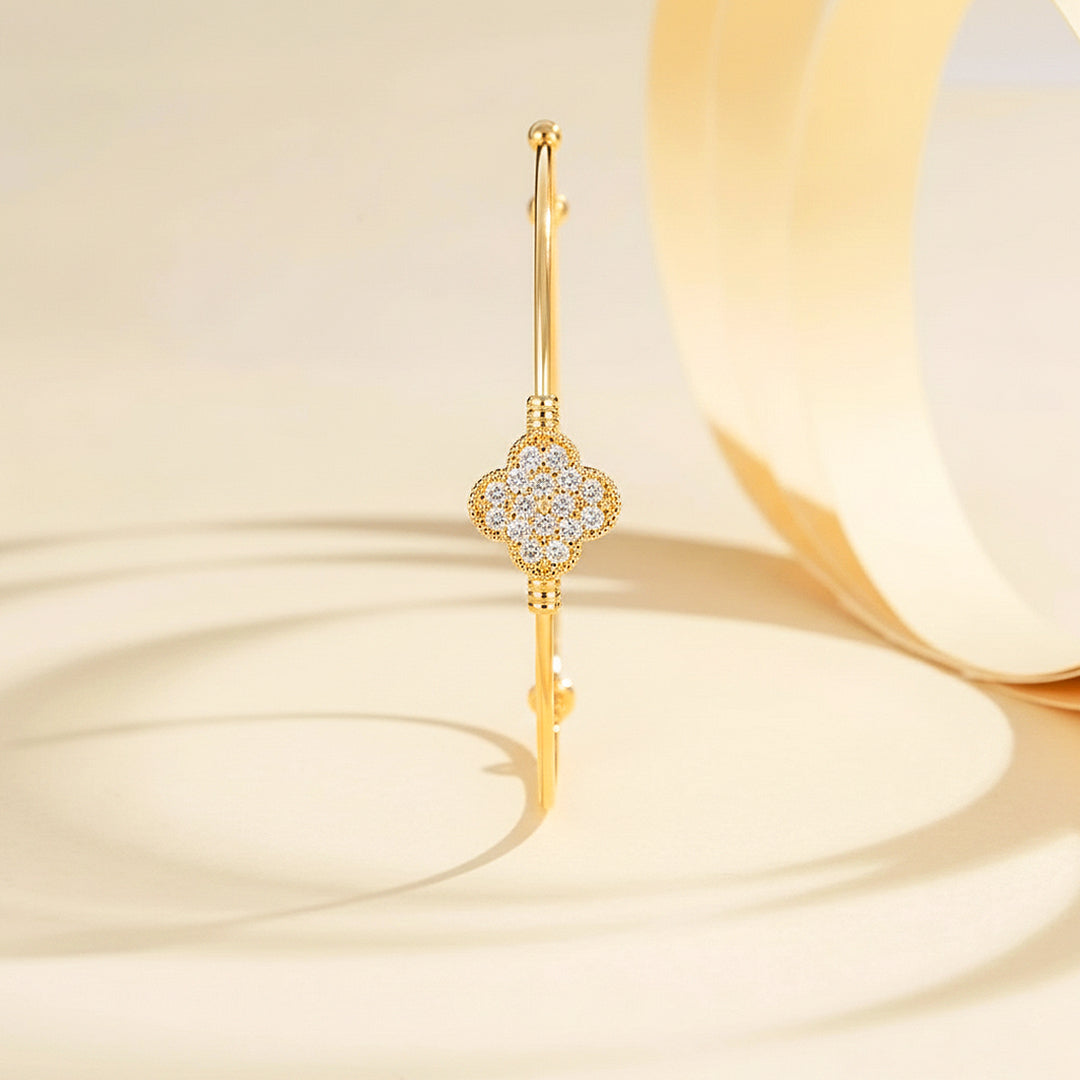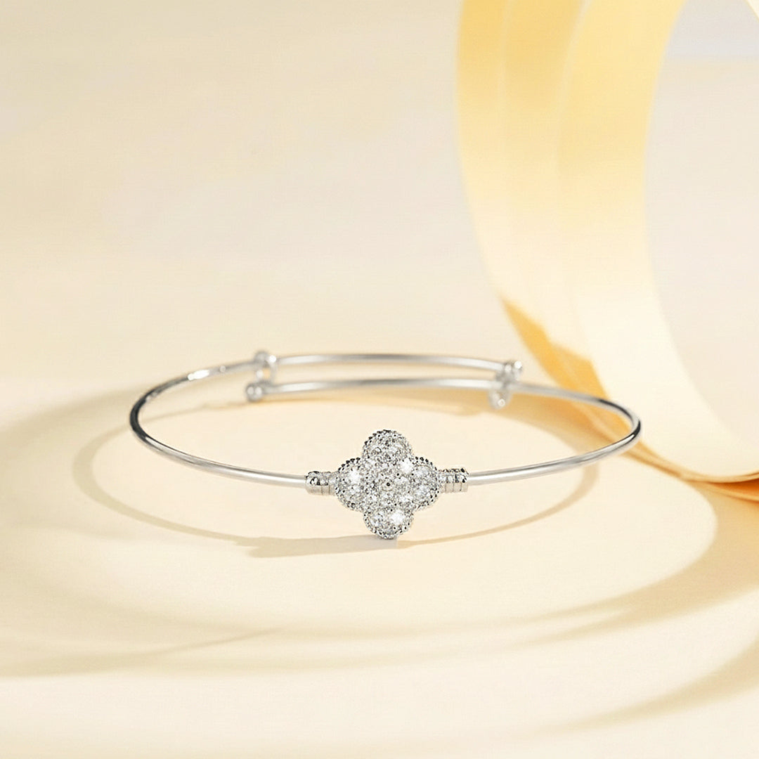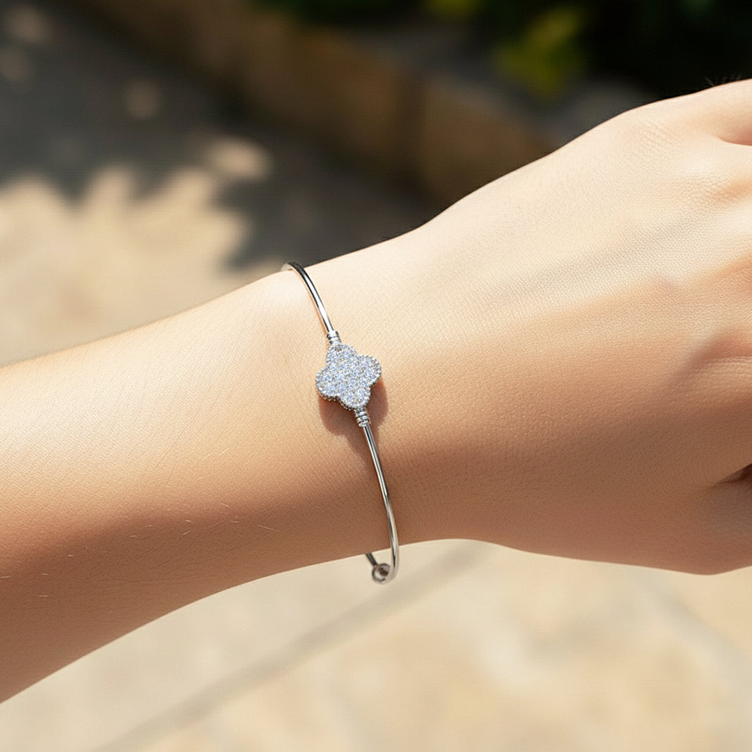 Elevate your everyday elegance with the Luxe6503 Pavé Clover Radiance Bangle, a stunning piece designed to shine effortlessly from day to night. At its centre sits a dazzling pavé clover motif—symbolising luck, beauty, and timeless charm—crafted with meticulous attention to detail. The slim, polished bangle creates an elegant frame for the radiant centrepiece, offering a refined sparkle with every movement.