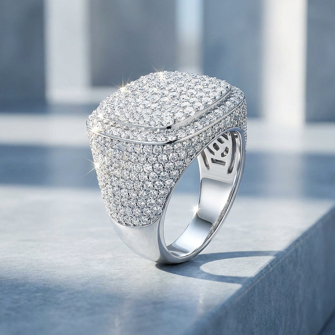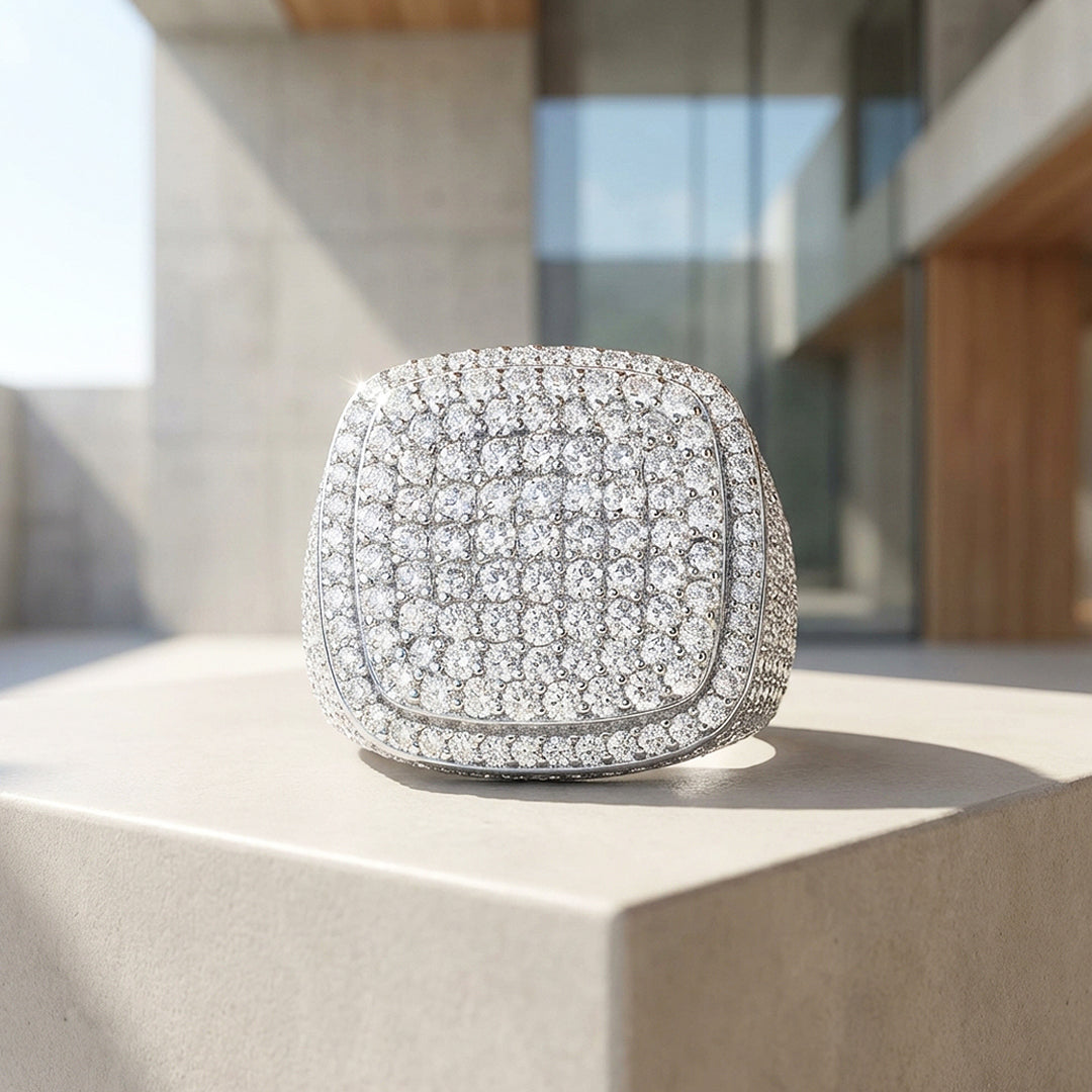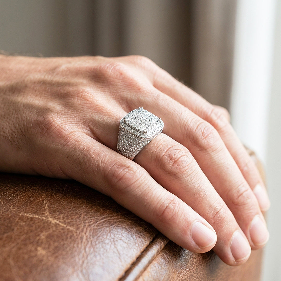 5.6 carats of Moissanite. That's the number — and it shows. A raised cushion-shaped signet face sits atop a fully iced band, every surface from the domed crown to the tapered shoulders covered in round Moissanite pavé without a single break. D Colour, VVS1 Clarity throughout, in solid 925 Sterling Silver with five layers of electroplating. Moissanite's fire exceeds diamond at every carat weight, and at 5.6 total carats, this ring produces a level of brilliance that is genuinely difficult to look away from. The definitive piece in the collection.