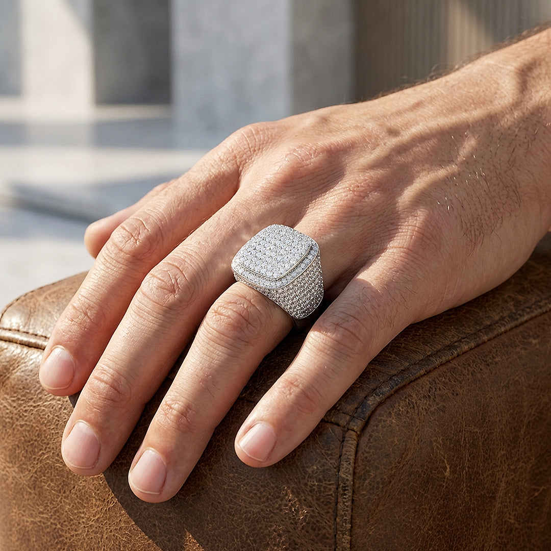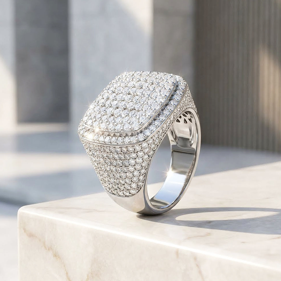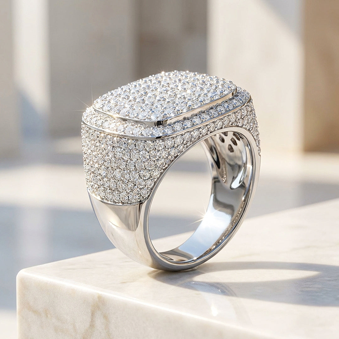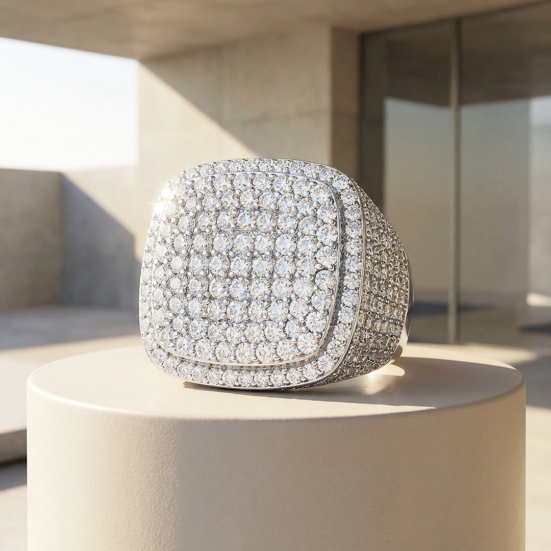 5.6 carats of Moissanite. That's the number — and it shows. A raised cushion-shaped signet face sits atop a fully iced band, every surface from the domed crown to the tapered shoulders covered in round Moissanite pavé without a single break. D Colour, VVS1 Clarity throughout, in solid 925 Sterling Silver with five layers of electroplating. Moissanite's fire exceeds diamond at every carat weight, and at 5.6 total carats, this ring produces a level of brilliance that is genuinely difficult to look away from. The definitive piece in the collection.