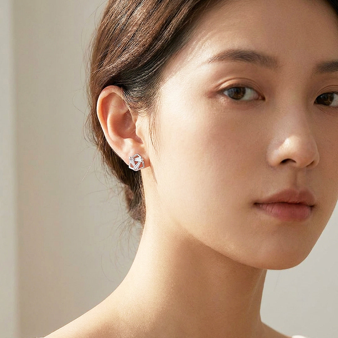 The Luxe3508 Earrings are for those who prefer their jewellery to have a point of view. An open pentagon frame holds a fan-like arrangement of baguette-cut Diamond Simulants — each stone radiating outward from a central point, creating a prismatic, almost architectural sparkle that reads as genuinely distinctive. Available in both silver and rose gold tones, the open metalwork frame allows the stones to take centre stage while adding structural character of their own. Small enough to wear to the office, interesting enough to wear everywhere else.