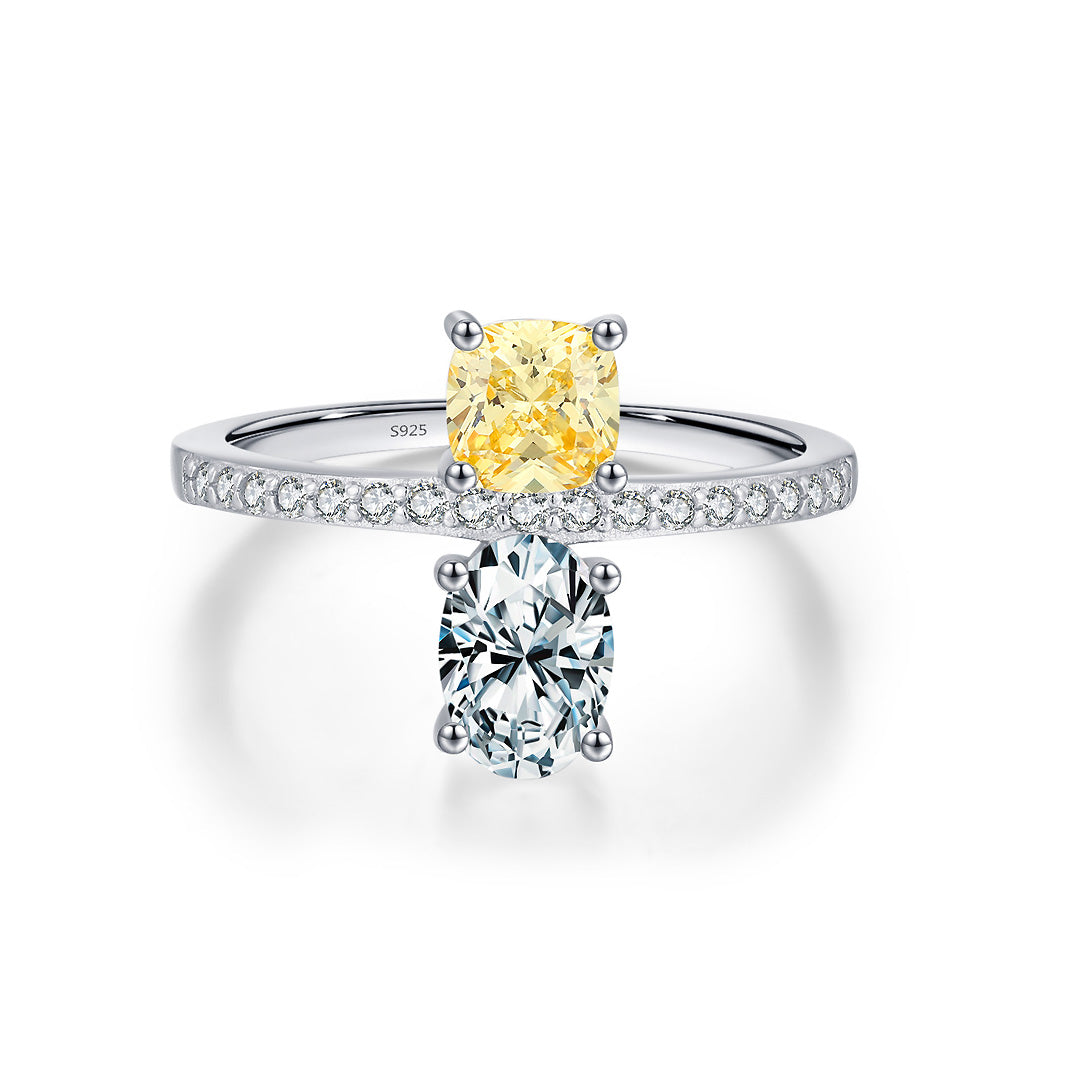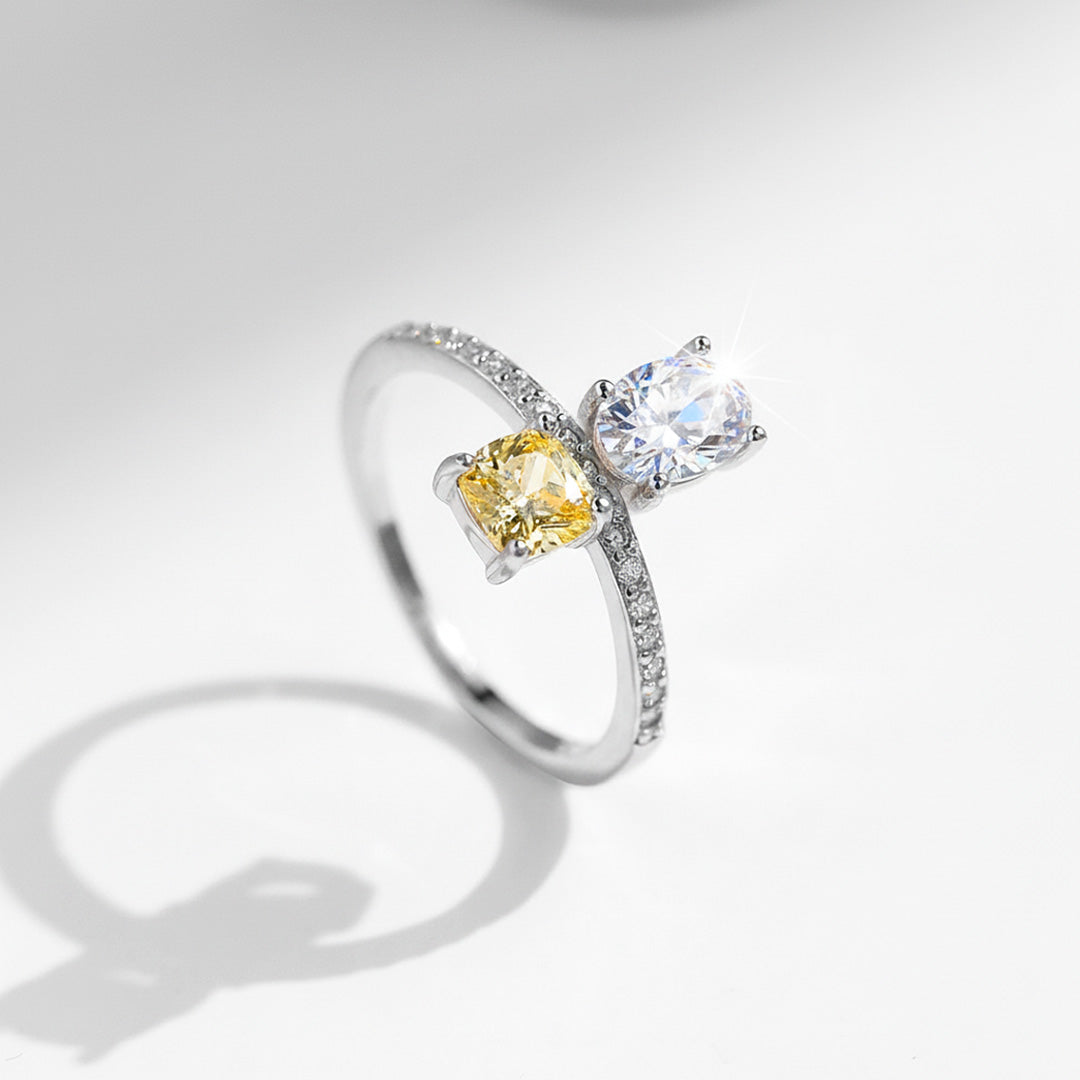 The Gemini – Prm7119 is a radiant statement of balance, duality, and elegance. Designed with two dazzling zircon stones in contrasting tones, this ring creates an irresistible play of light and brilliance. One stone radiates a warm golden glow while the other shines with icy clarity, symbolizing harmony in opposites. The band, meticulously crafted from premium 925 sterling silver, is adorned with pavé-set zircons that add even more sparkle and sophistication.