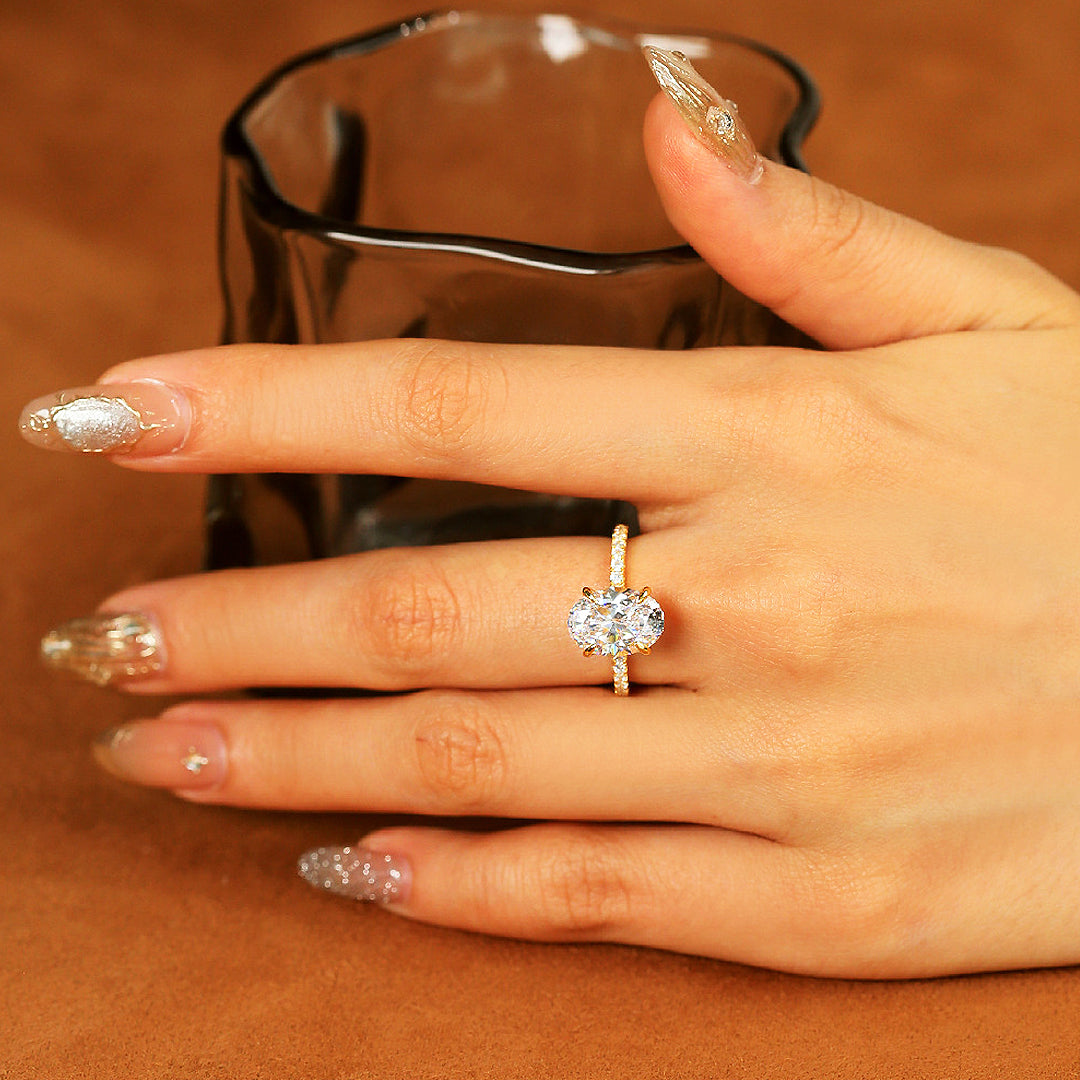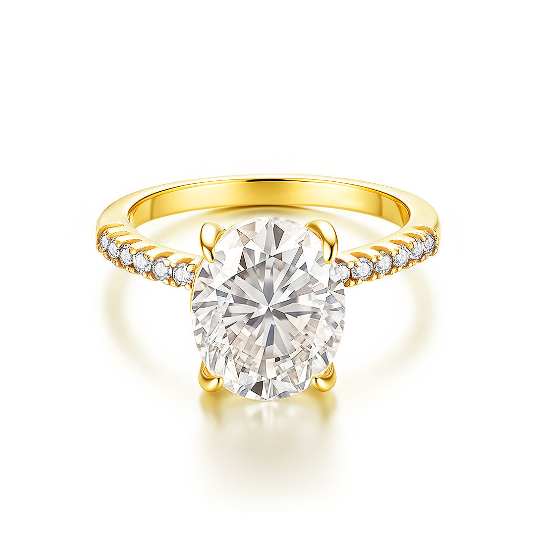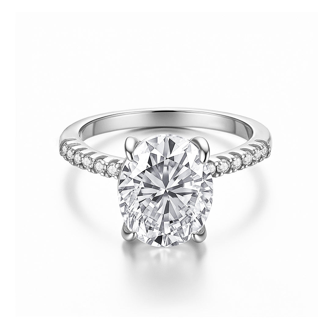Experience the pinnacle of luxury with Regalia, the crown jewel of our Premium Collection—designed for those who embrace elegance that captivates at first sight. At its heart lies an extraordinary 5-carat D colour VVS1 moissanite, a gemstone so brilliant that it commands every ray of light and transforms it into a dazzling display of fire and clarity. Its beautifully faceted oval cut is elevated by a secure, refined prong setting that enhances its luminosity from every angle, creating an aura of grandeur that is impossible to ignore.