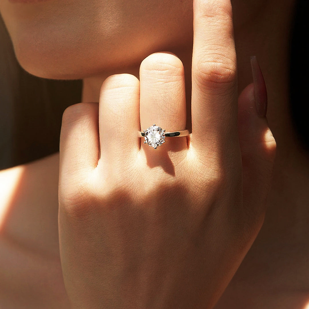 Introducing Lustre, an impeccably refined solitaire masterpiece from our Premium Collection — crafted for those who desire elegance that feels exquisitely elevated. This luxurious ring showcases a flawless round-cut Moissanite in D colour and VVS1 clarity, radiating an intense, diamond-like fire that steals the eye in any light. Set upon a smooth, polished 925 sterling silver band, the centre stone floats gracefully in a secure six-prong setting, enhancing its brilliance with a captivating, uninterrupted sparkle.