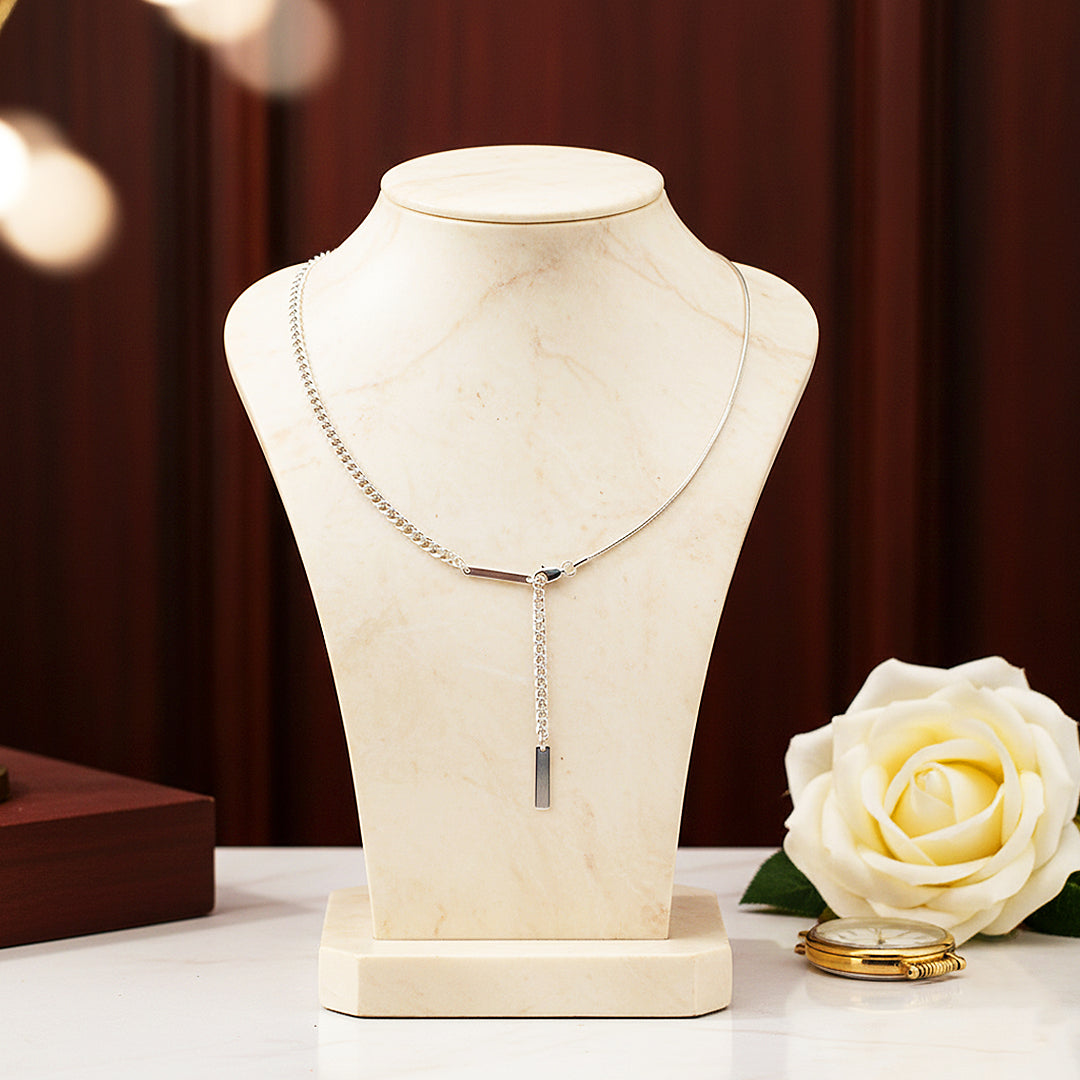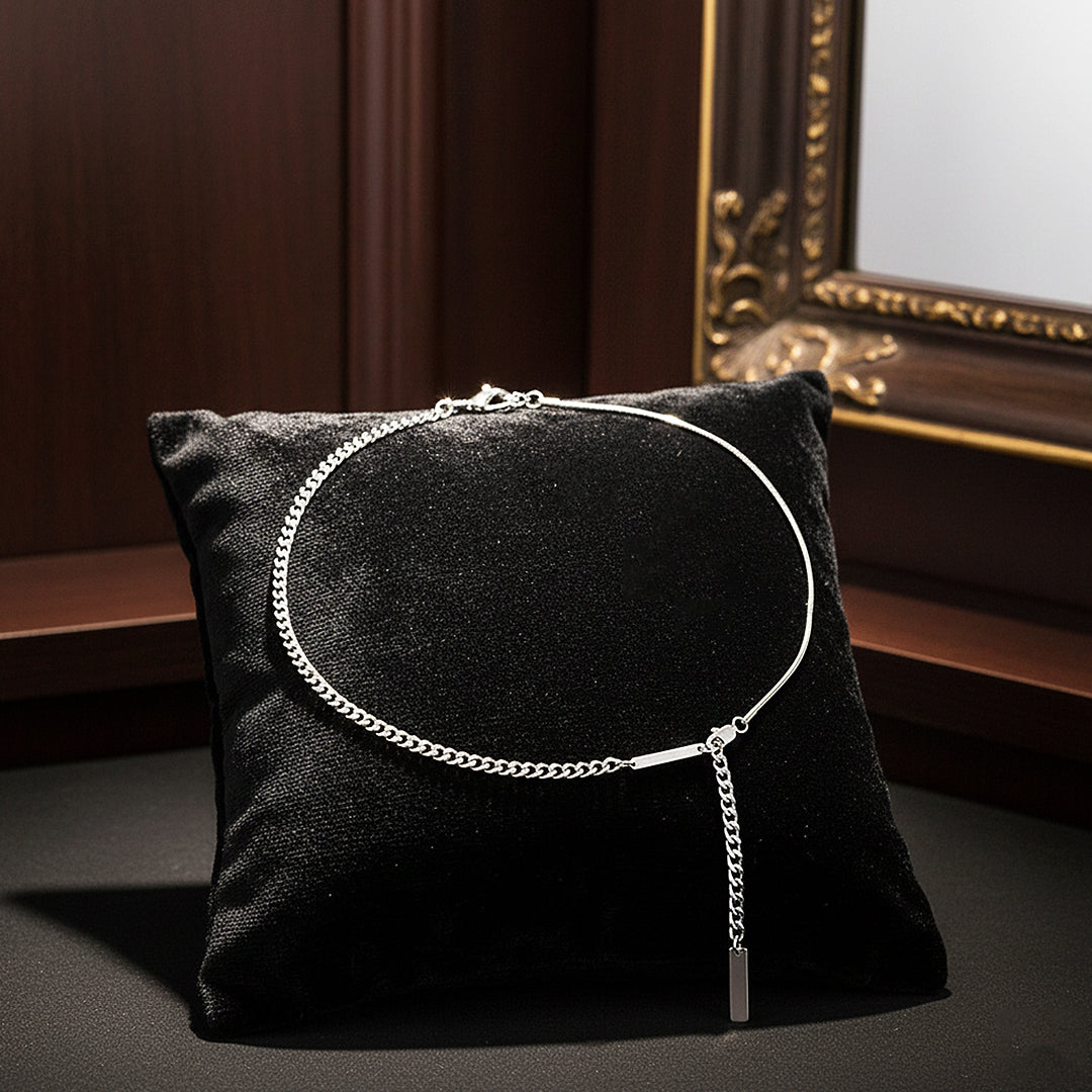 Modern and fashion-forward, the MN1064 Dual-Link Drop Luxe Necklace combines two distinct chain styles into one striking design. One side features a sleek snake chain, while the other is crafted with bold curb links, meeting in a vertical drop accent finished with a minimalist titanium steel bar. The result is a versatile necklace that’s both edgy and sophisticated, perfect for layering or making a solo statement.