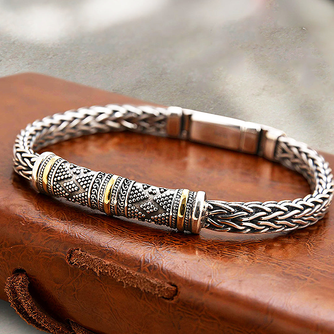 Elevate your everyday style with The Esquire Bracelet, a bold fusion of intricate detail and commanding presence. Featuring a distinctive central motif with architectural precision, this bracelet is paired with a sleek woven chain that wraps the wrist in strength and style. Every element is meticulously designed to reflect confidence, character, and sophistication.