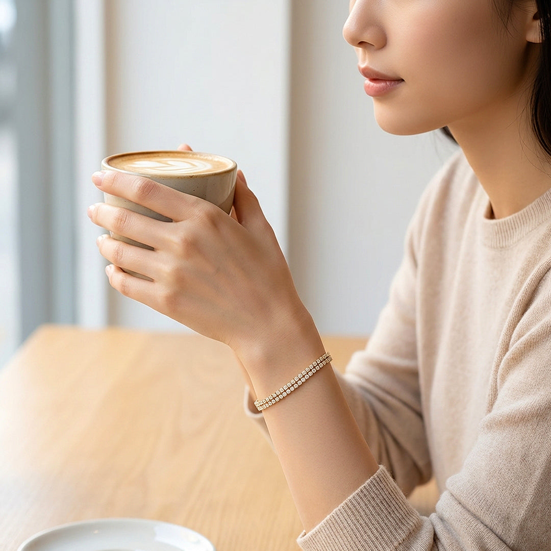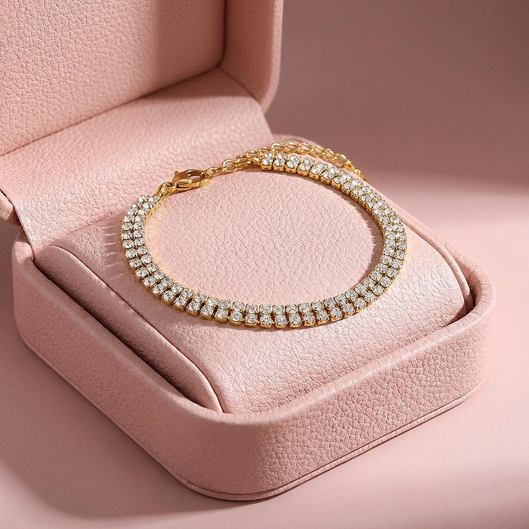One row of diamond simulant stones is elegant. Two rows is a statement. This double-row tennis bracelet packs an impressive amount of brilliance into a remarkably wearable design — two continuous lines of prong-set diamond simulant stones running the full length of the bracelet, side by side, with barely a sliver of gold visible between them. The effect is striking without being heavy, glamorous without trying too hard. The kind of piece that makes an outfit feel finished the moment you put it on.