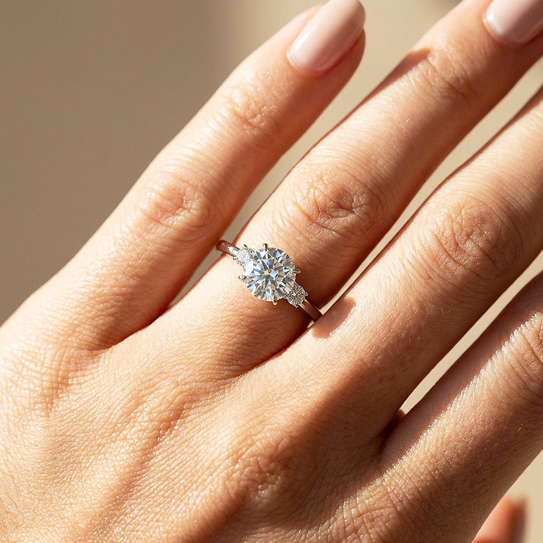 A timeless expression of balance and brilliance, the Eternal Trinity ring features a radiant round centre stone framed by two delicately set side stones. The clean, refined band allows each element to shine with clarity, creating a silhouette that feels effortlessly elegant and enduring in its appeal.