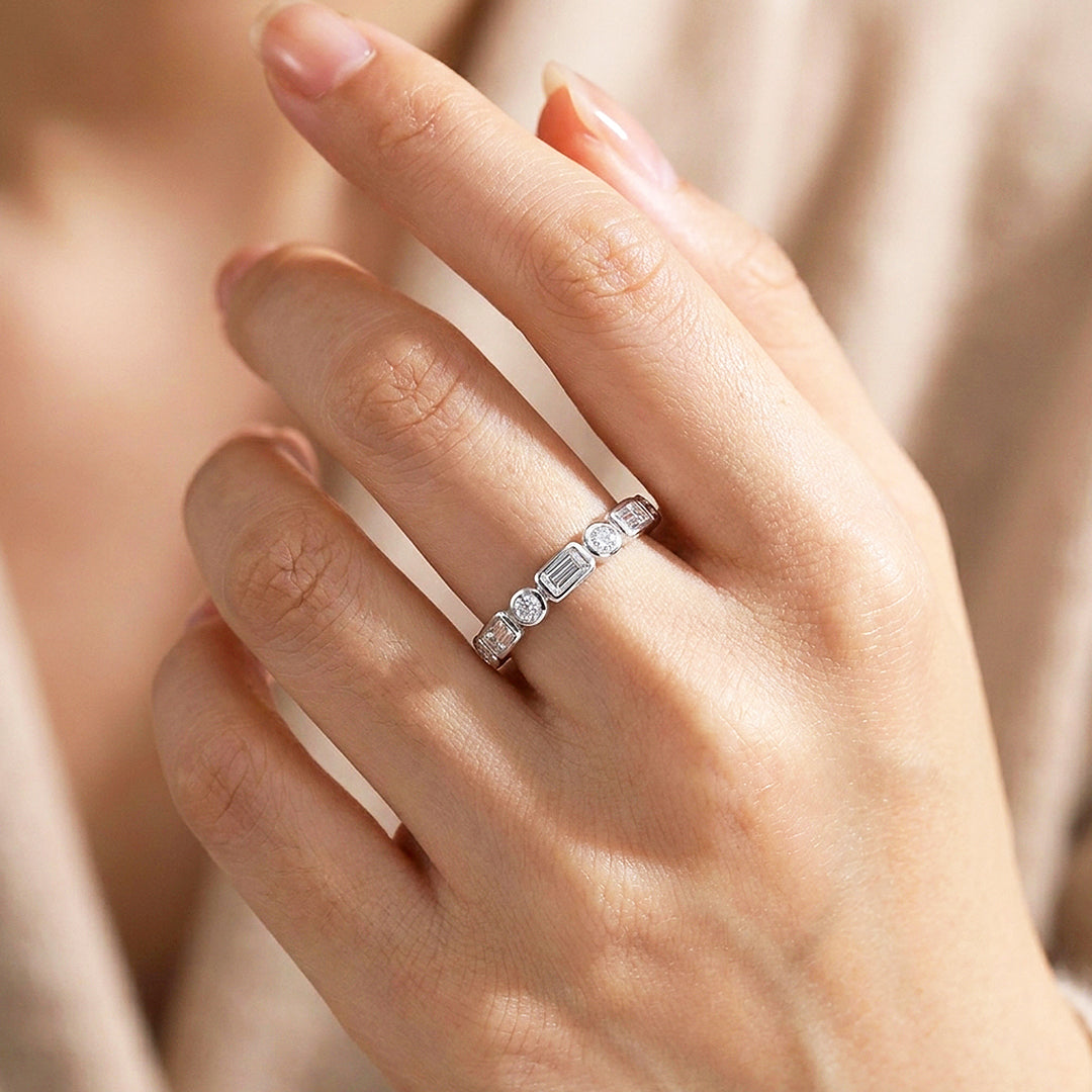 금속을 믹스하는 것은 신중하게 하면 세련된 스타일을 연출할 수 있습니다. 색상이나 디자인처럼 공통된 요소가 있는 반지를 선택해 통일감 있는 룩을 완성해보세요.