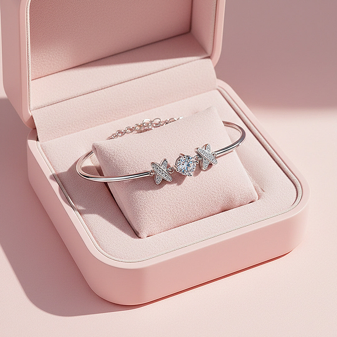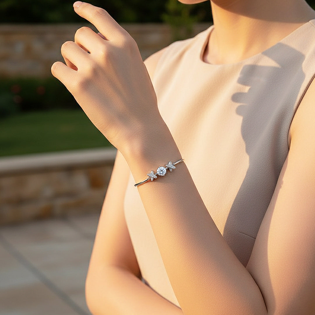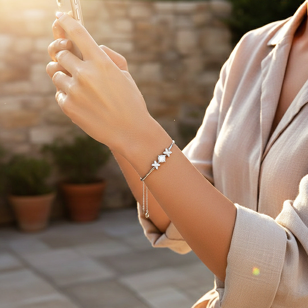 The graceful double-loop side accents, adorned with shimmering micro-set stones, flow seamlessly into an adjustable chain that drapes elegantly across the wrist. Crafted in premium 925 Sterling Silver and finished with five layers of electroplating, this bracelet offers enduring shine, strength, and comfort. Emerald Radiance is designed for the woman who appreciates clean lines, architectural beauty, and uncompromising brilliance — a timeless piece that captures attention with every movement.