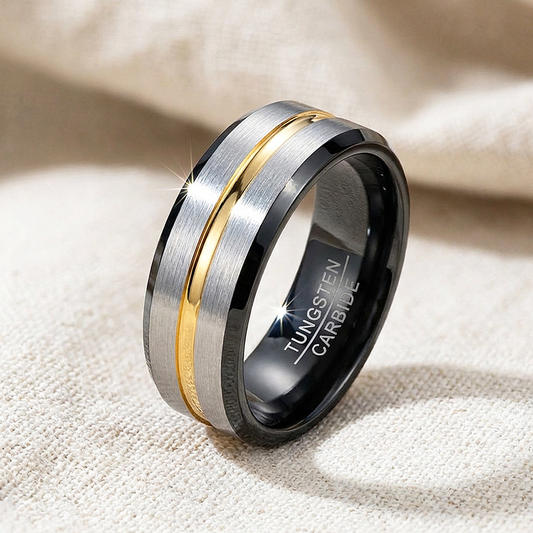 텅스텐 카바이드는 극도의 경도, 물/변색 저항 및 긁힘에 대한 높은 저항성 덕분에 가장 인기 있고 최고 품질의 반지 재료입니다. 18K 금보다 약 10배 더 단단합니다. 결혼 반지로 인기가 많습니다.