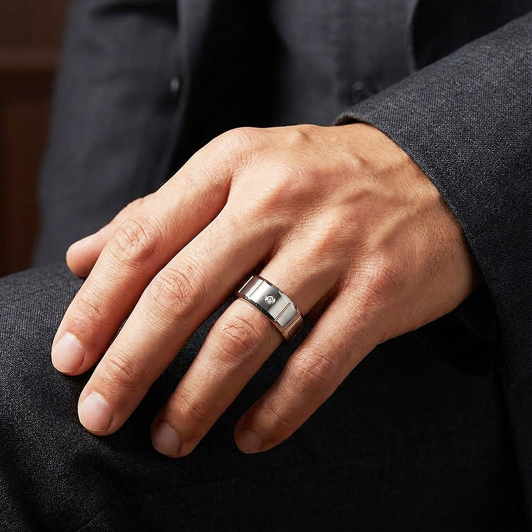 The Orvion is a ring that rewards a closer look. A polished tungsten carbide band with rose gold-tone edges, a warm rose gold interior and subtle vertical groove accents running across the face, it balances two tones with a confidence that feels entirely natural. At the centre, a single bezel-set diamond simulant catches the light without competing for it — present, precise and perfectly placed. For those who appreciate detail in its most considered form, the Orvion is a ring worth wearing every day.