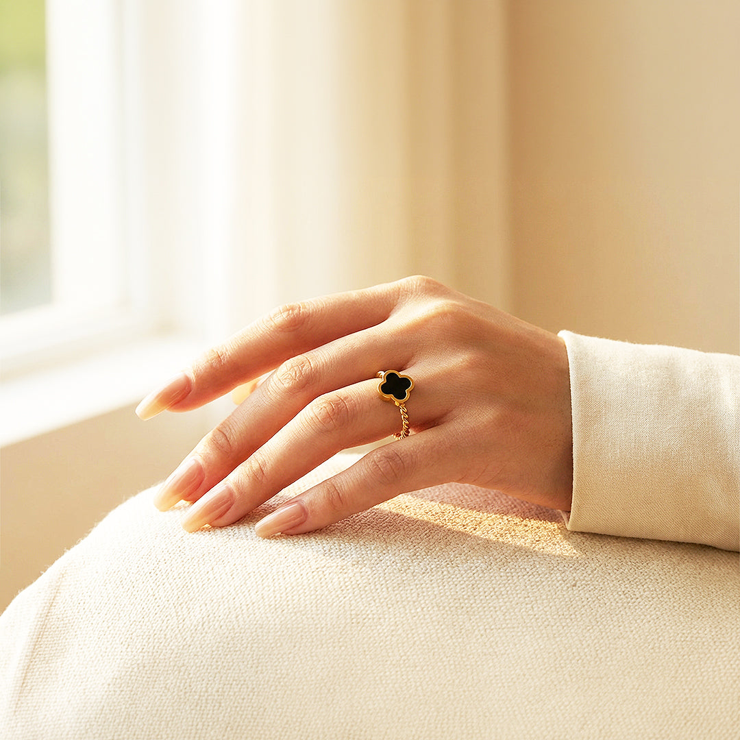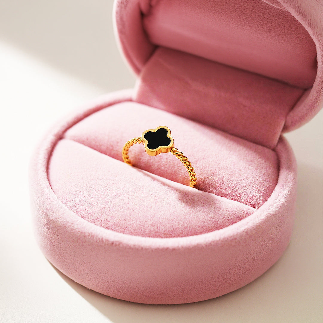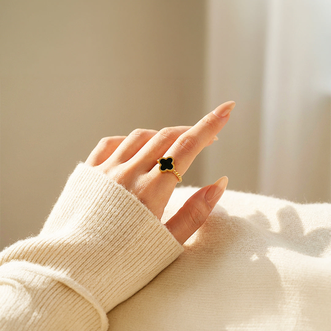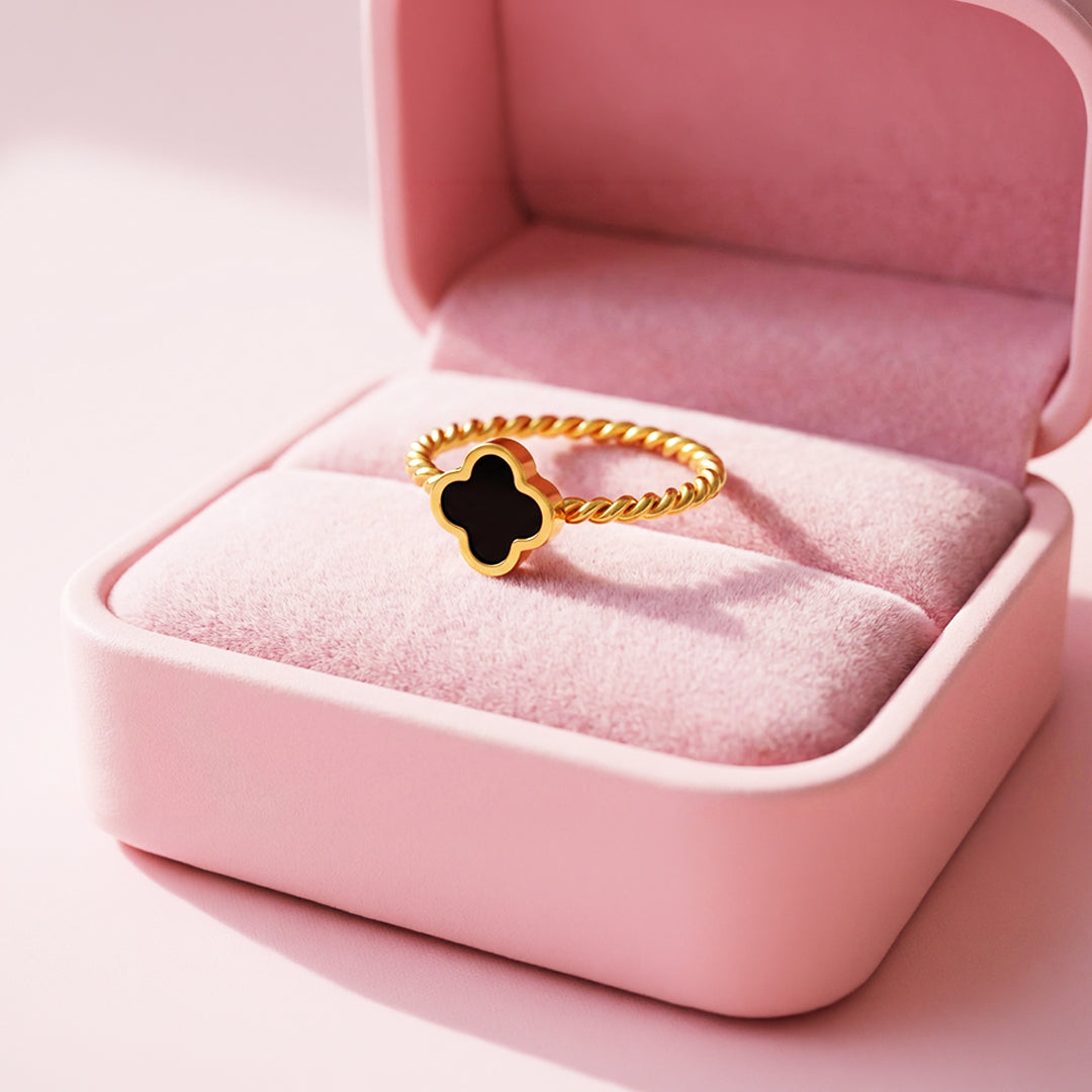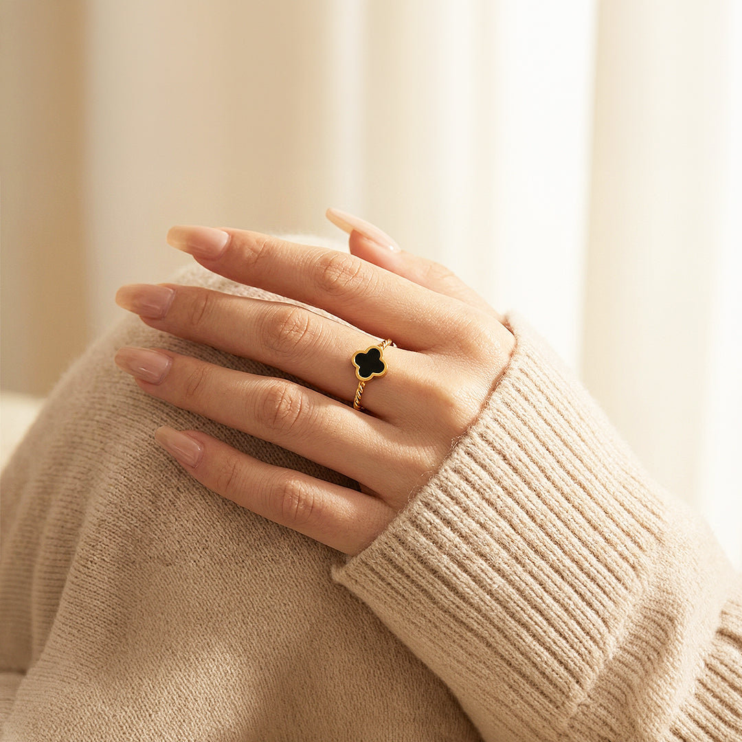 Bring timeless elegance to your everyday look with the Luxe5120 Ring, crafted from premium titanium steel for lasting beauty and strength. Its signature design features a black enamel clover set atop a twisted gold band, blending sophistication with modern minimalism. ✨