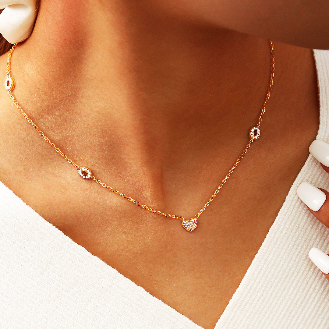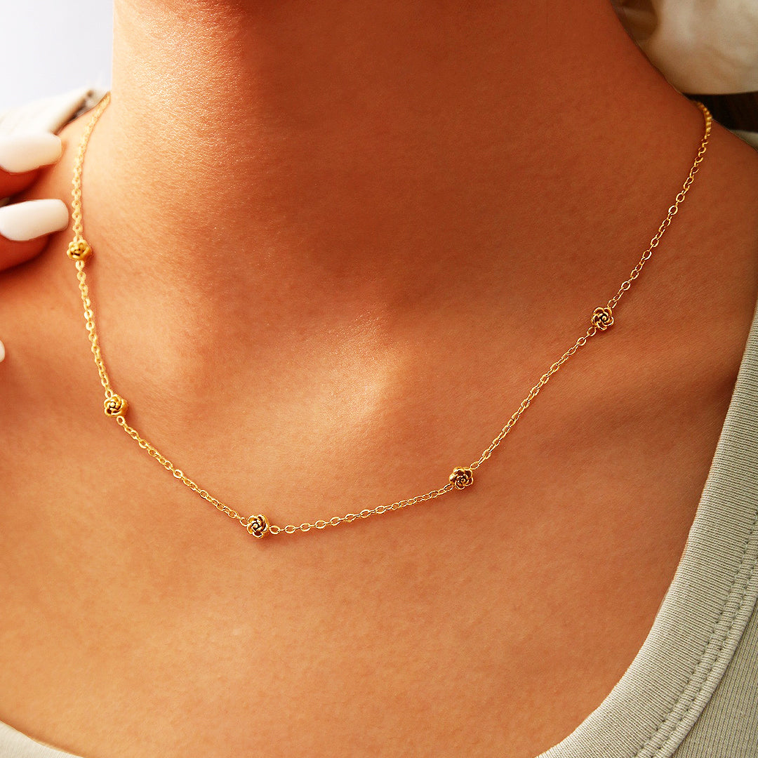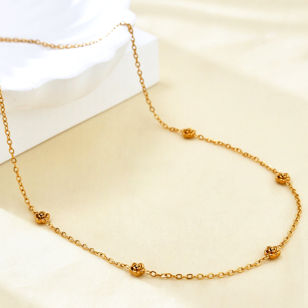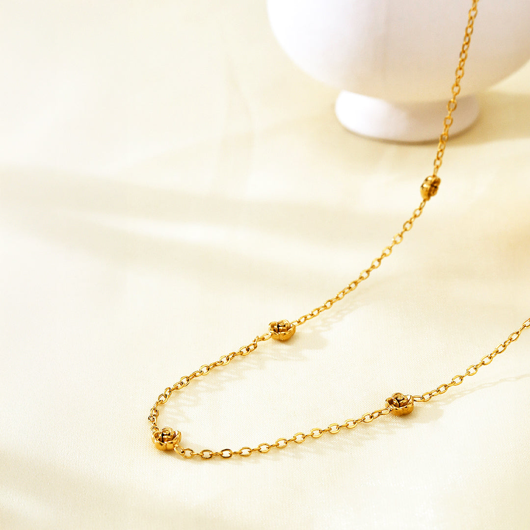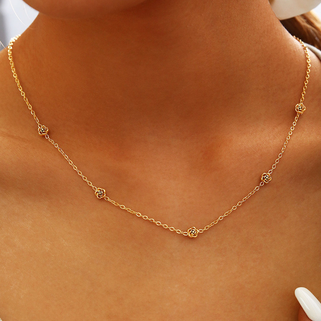 The entire necklace is finished in a luminous, warm Gold Plating, applied via a robust five-layer electroplating process that ensures spectacular, lasting color. The elegant spacing of the rose stations creates a beautiful, continuous pattern that is both romantic and understated. This necklace is an irresistibly chic and versatile treasure, offering a refined, quiet luxury that adds a delightful, golden radiance to your look.