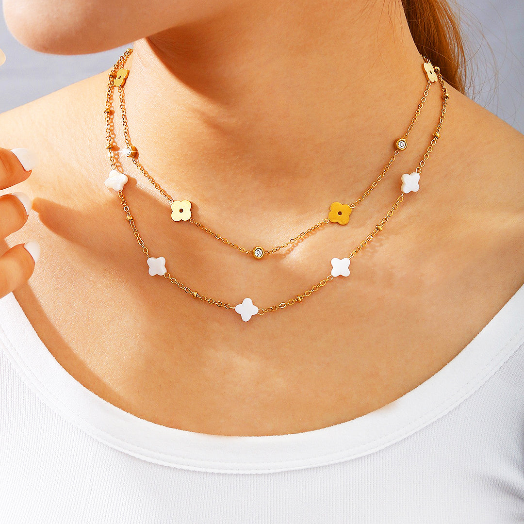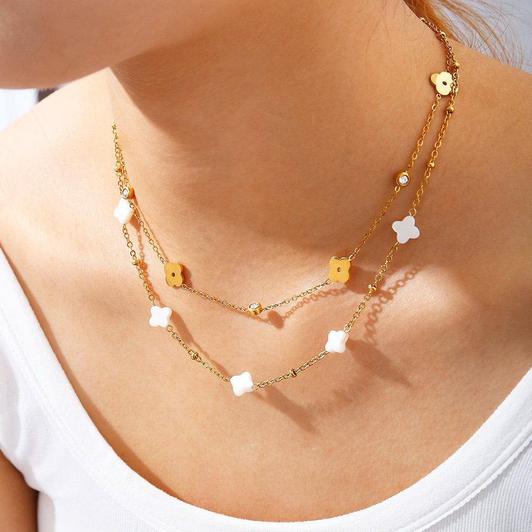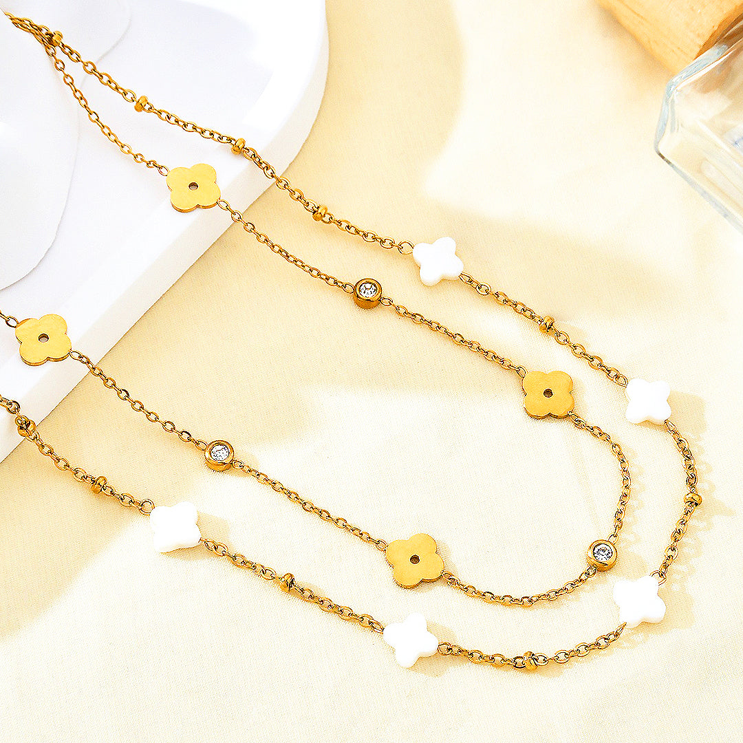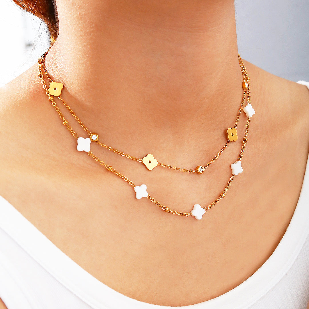 Adorn your neckline with the captivating elegance and effortless layering of the Luxe4432 Golden Clover Necklace. This unique piece features a built-in double-strand design, offering the coveted layered look in one secure necklace. The two fine gold chains are beautifully interspersed with a continuous pattern of alternating gold-plated and luminous white enamel clover stations, creating a dynamic, high-contrast visual that is both luxurious and charming. Adding a touch of concentrated light, small Simulant Diamond stations are placed between the enamel clovers, providing delicate sparkle.