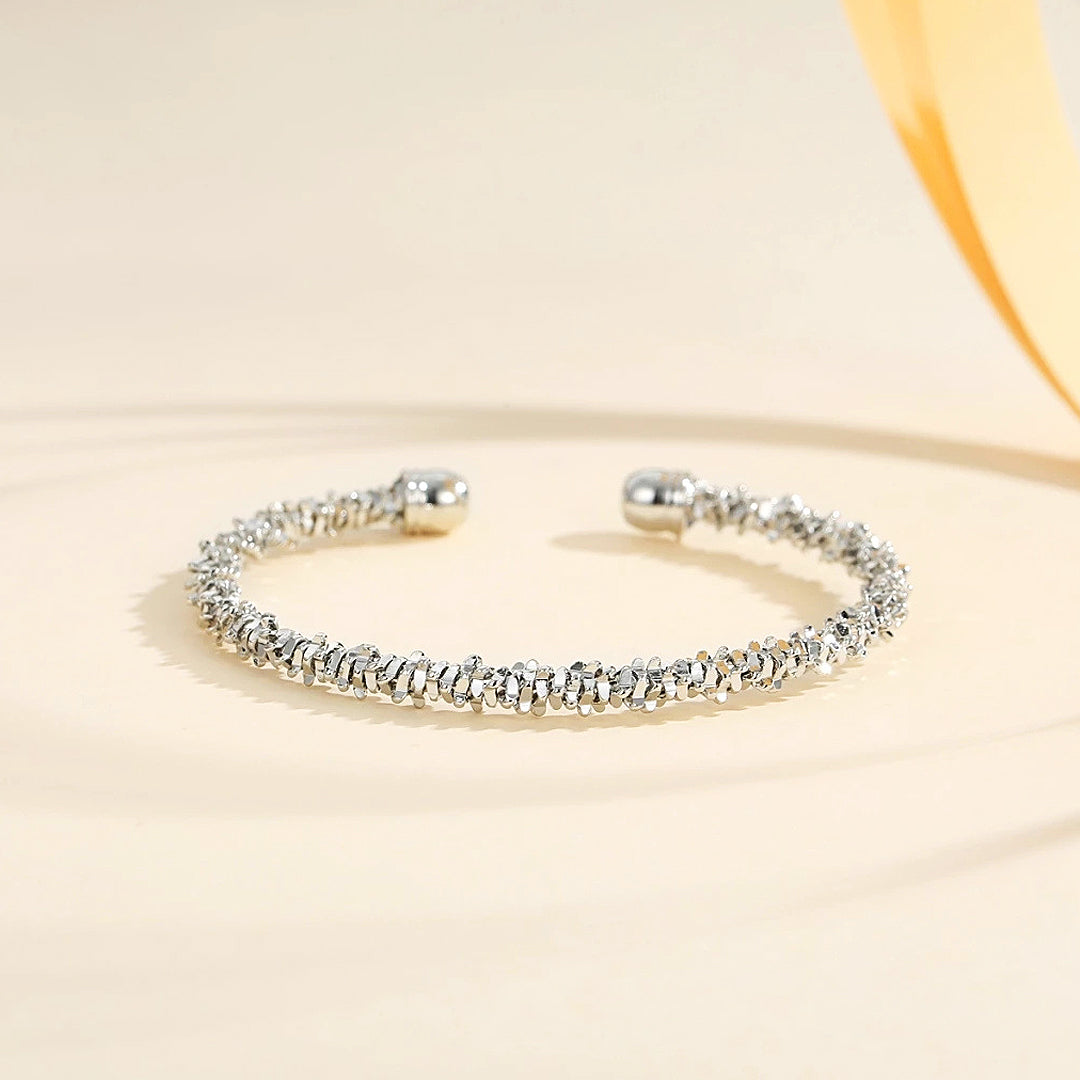 The Luxe6500 Cuff is where refined elegance meets sculptural artistry. Crafted with a distinctive textured silhouette, each tiny reflective element catches the light with mesmerizing brilliance, creating a sparkling halo effect around the wrist. The open-cuff design is finished with smooth rounded caps, giving the piece a polished and luxurious profile while ensuring effortless wear. Available in both radiant gold and luminous white gold plating, this cuff instantly elevates any outfit—whether worn alone as a statement piece or stacked for a modern, layered look.