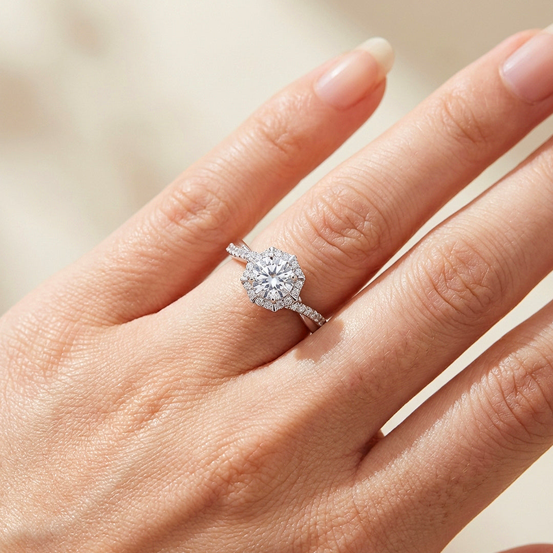 Hexagon Halo Moissanite Ring | 925 Sterling Silver | PRM7126