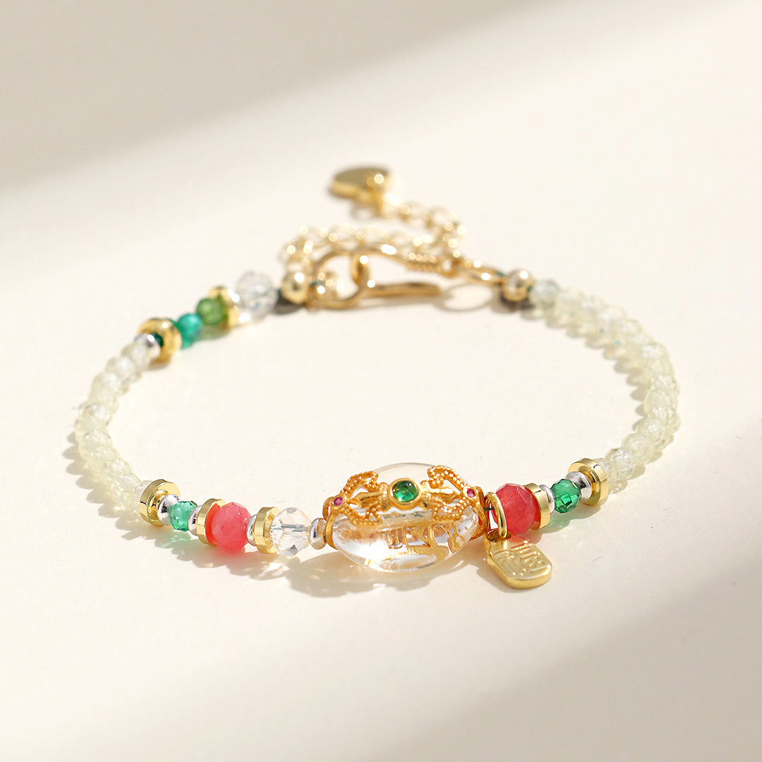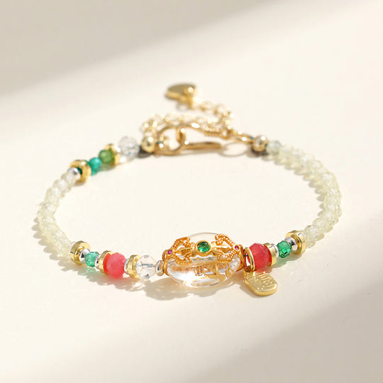A graceful symbol of wealth and protection, the Dragon’s Blessing bracelet blends tradition with elegance. At its centre is a majestic golden dragon nestled within clear crystal, bringing strength, courage, and prosperity to its wearer.