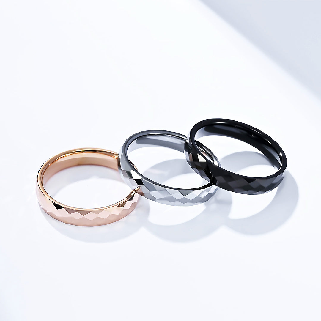 Sleek, modern, and enduring—our Facet Tungsten Ring is the perfect fusion of style and strength. Crafted with precision-cut faceted edges, this 4mm band reflects light with every movement, adding subtle brilliance to your everyday look. Available in 3 classic colors, this unisex ring suits any style and occasion.