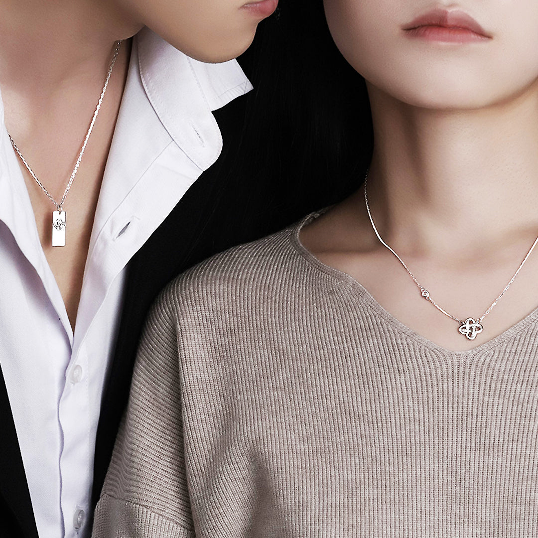 Celebrate the unbreakable bond between two hearts with the Knot of Destiny Couple Necklace. Crafted with elegant precision, each necklace tells a story of intertwined souls destined to be together. The men's piece features a sleek rectangular pendant adorned with a minimalist Celtic knot, while the women’s necklace showcases a sparkling, clover-like knot encrusted with shimmering cubic zirconia stones. Together, they represent unity, harmony, and love that knows no end.