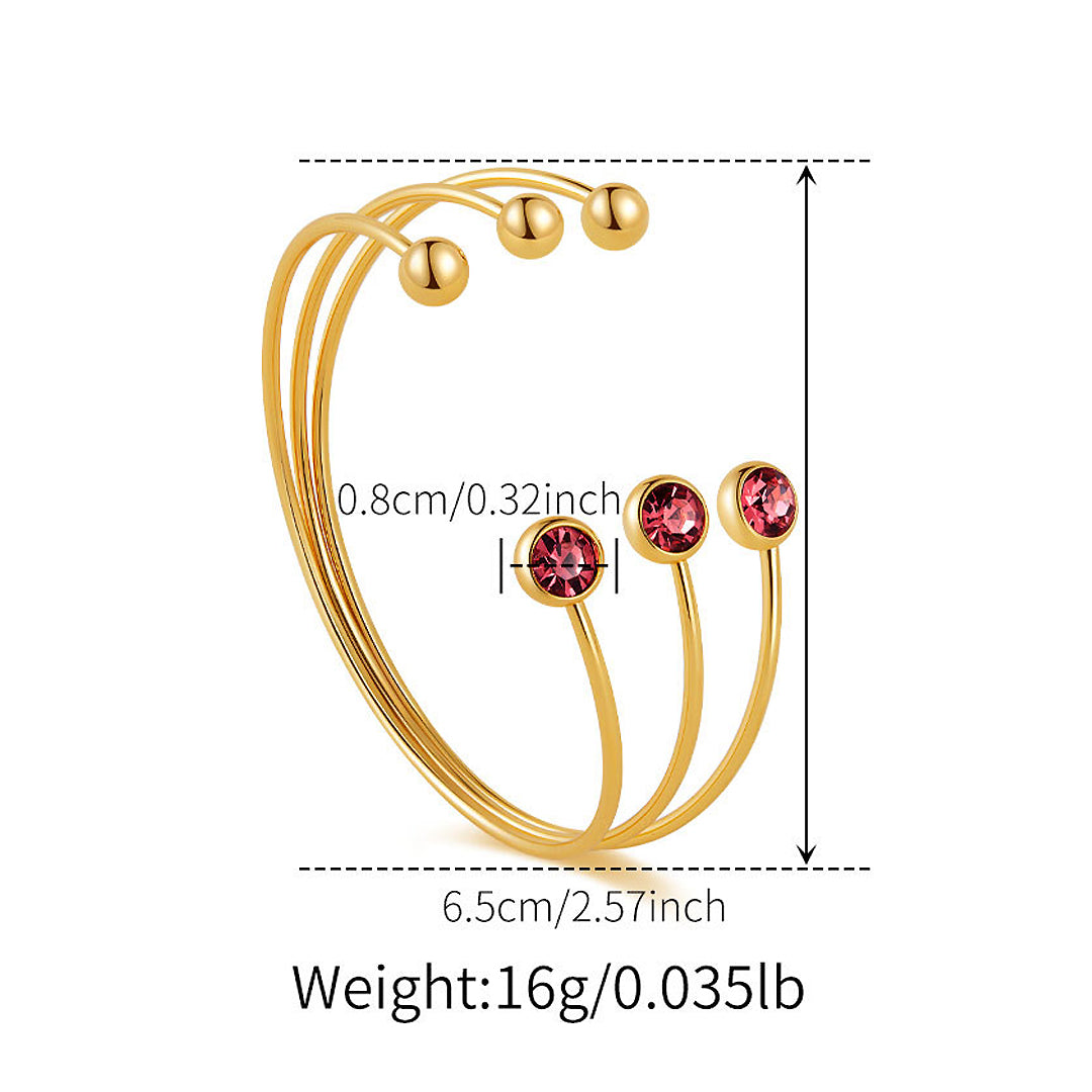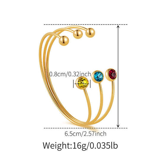Elevate your look with the Luxe6465 Orbit Gemstone Cuff – a bold and sculptural piece that blends modern minimalism with a cosmic twist. This striking open cuff features three sleek golden bands that curve gracefully around the wrist, ending in polished spheres and bezel-set gems that seem to float in space.