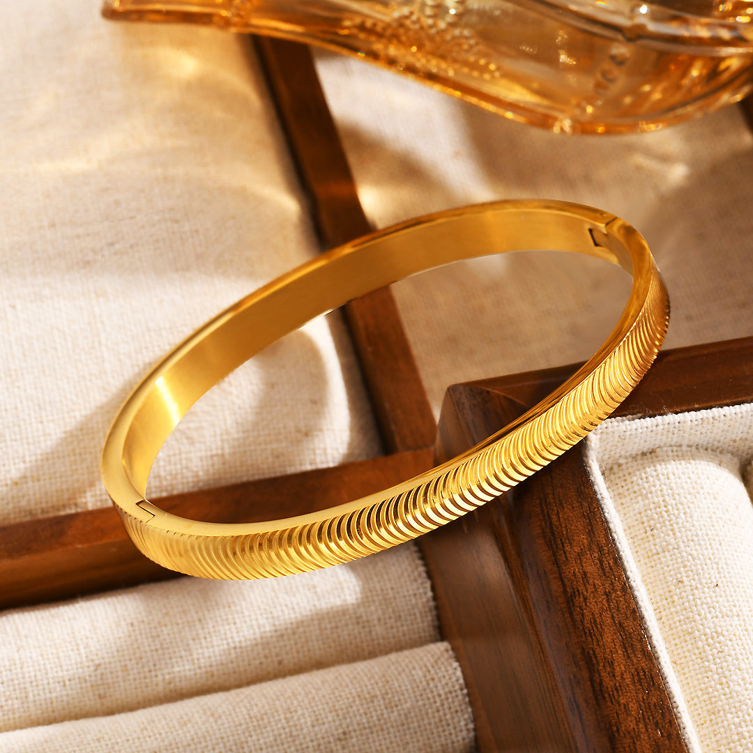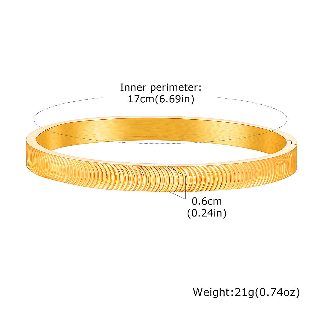 The Luxe6474 Bangle features a brilliant gold-plated finish that gleams with the luxurious warmth of pure gold. Its striking design is defined by an exquisite textured surface, boasting intricate, parallel grooves that create a mesmerizing play of light and shadow with every movement. This unique texture adds depth and modern appeal, making the bangle feel both substantial and artfully crafted. Measuring a comfortable 17cm (6.69in) inner perimeter and 0.6cm (0.24in) wide, it offers a perfect fit and a noticeable yet elegant presence on your wrist. Weighing a solid 21g (0.74oz), it feels luxurious and high-quality.