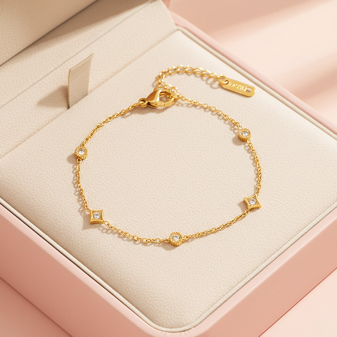 Delicately designed with a fine gold chain, Luxe6525 – Golden Celeste features a graceful arrangement of sparkling cubic zirconia stations, alternating between round halo accents and elegant geometric motifs. Each stone is precisely set to maximise light reflection, creating a radiant shimmer with every movement of your wrist. The refined spacing of the elements gives the bracelet a balanced, airy feel — feminine, modern, and effortlessly luxurious.