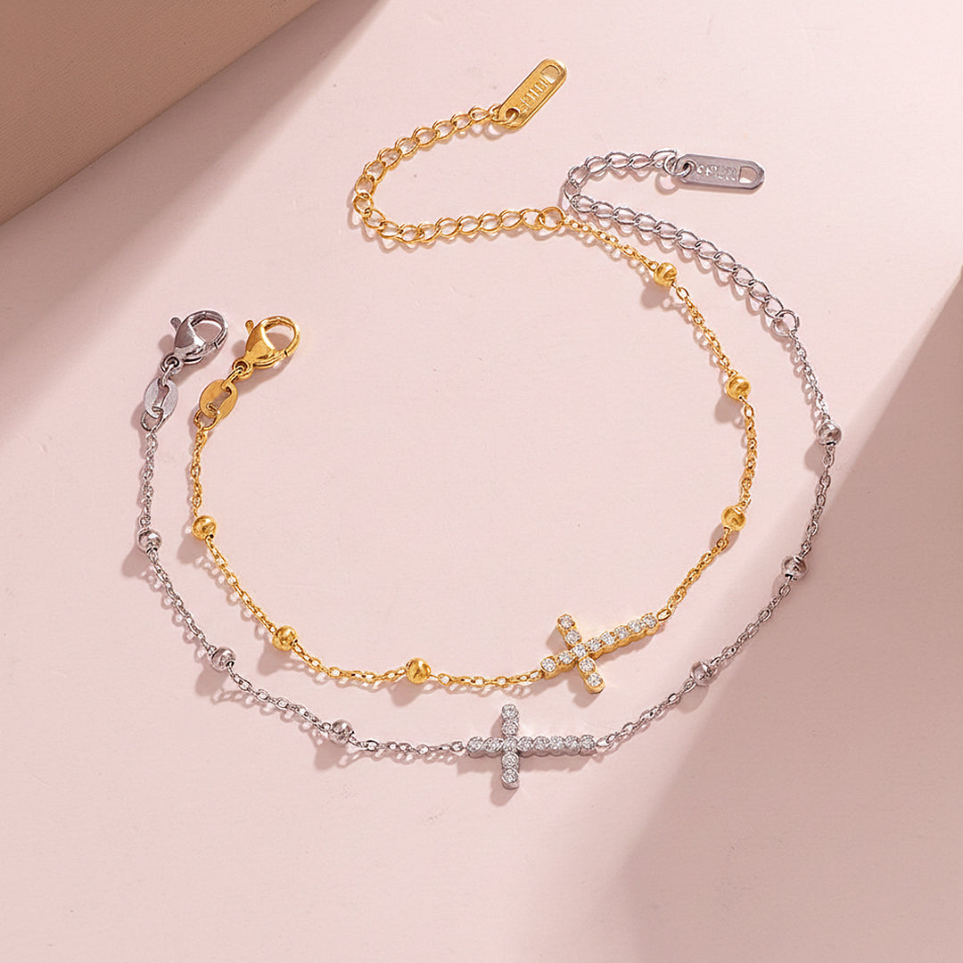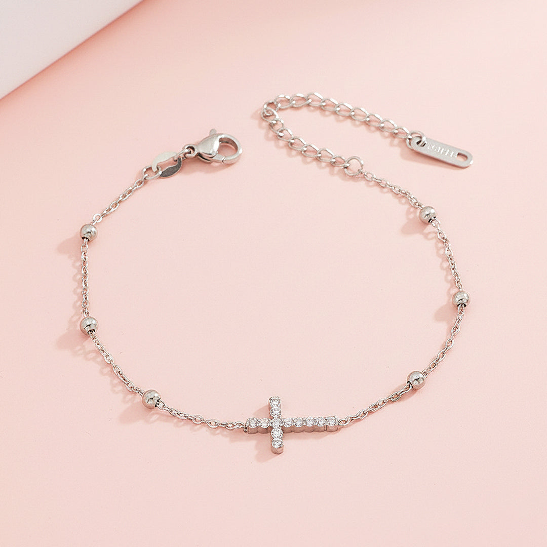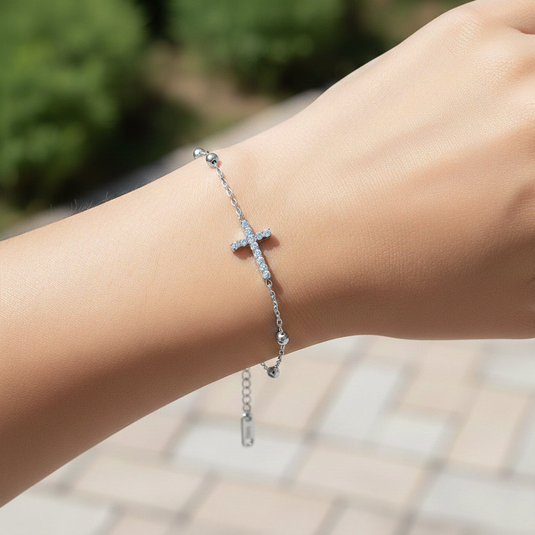 Luxe6526 – Radiant Faith is a delicate expression of elegance and devotion, designed with a refined chain accented by polished bead details and a brilliant cross centrepiece. The cross is meticulously set with sparkling AAAAA cubic zirconia stones, each precisely aligned to reflect light beautifully from every angle. The balanced proportions and fine craftsmanship create a graceful silhouette on the wrist, offering a look that is both meaningful and effortlessly luxurious.