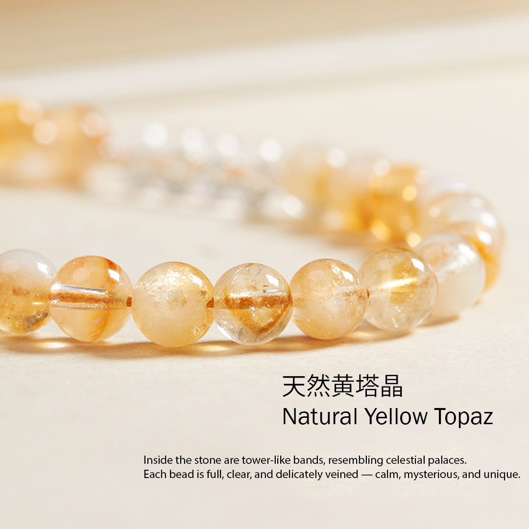 The Crystal Harmony CD100 exudes a warm golden glow that captures the essence of sunlight and serenity. Each bead of Natural Yellow Topaz reveals delicate, tower-like inclusions that shimmer softly under light, paired perfectly with the luminous Clear Quartz for a refined, radiant finish. Its soothing hues of amber and clear tones evoke feelings of calm and positivity, effortlessly blending sophistication with spiritual meaning.