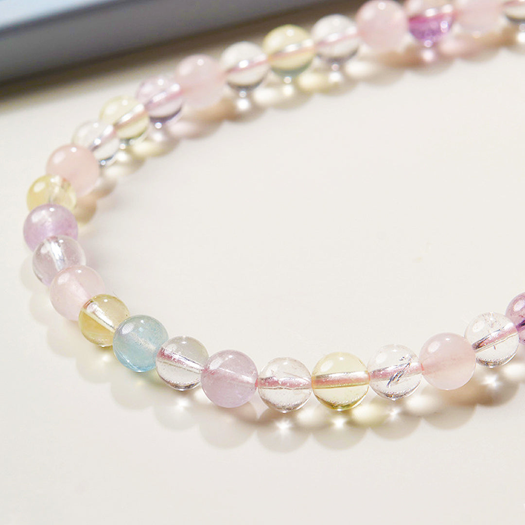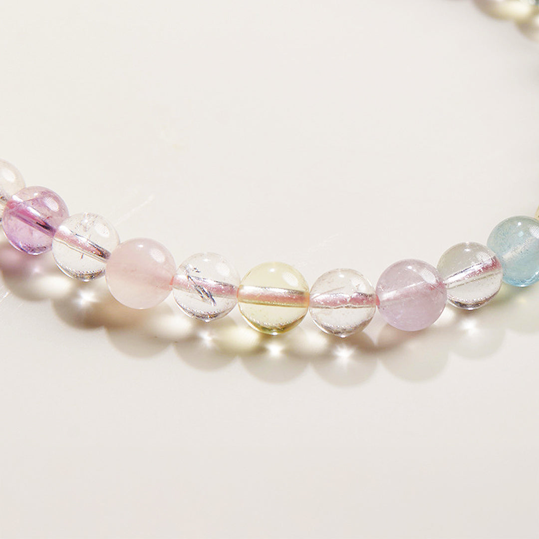 The Aurora Harmony CD107 shimmers like a pastel dream — a graceful union of Aquamarine, Rose Quartz, Citrine, and Amethyst that captures the beauty of dawn’s first light. Each delicate bead glows with soft hues of pink, lavender, and sky blue, radiating an aura of peace and positivity.