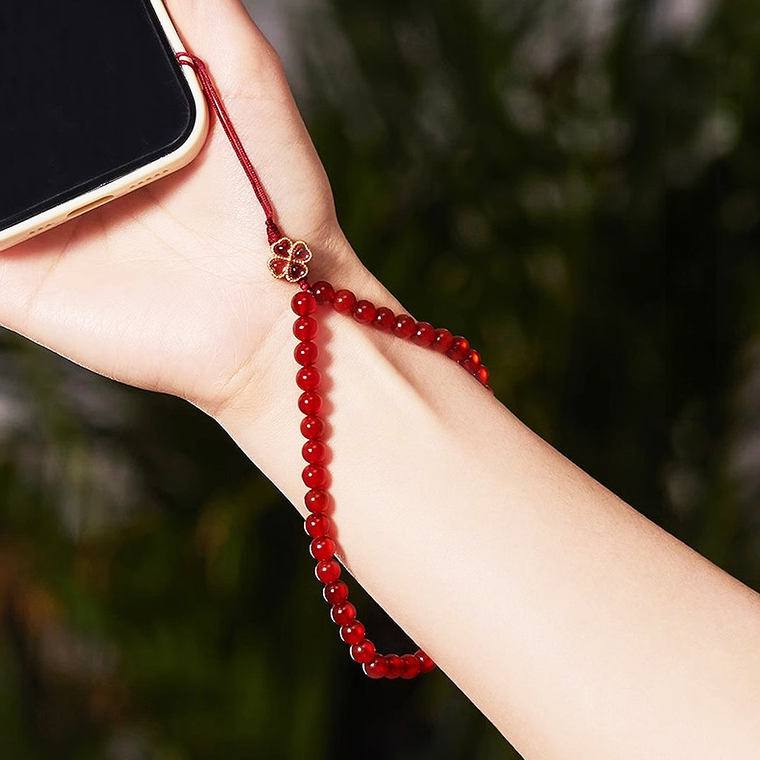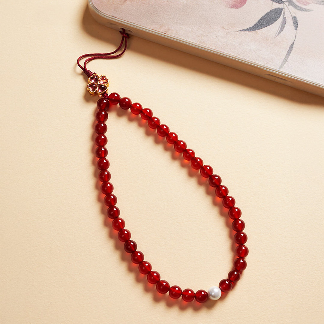 The Crimson Agate Charm radiates warmth and strength through its deep red hue — a captivating symbol of vitality and protection. Crafted from premium Red Agate beads, each piece glows with a natural translucence that embodies energy, confidence, and emotional grounding. The soft luster of the Shell Pearl adds a touch of serenity, harmonizing perfectly with the fiery red tones. At the top, a gleaming gold-foil four-leaf clover completes the design — a timeless emblem of good luck and happiness.
