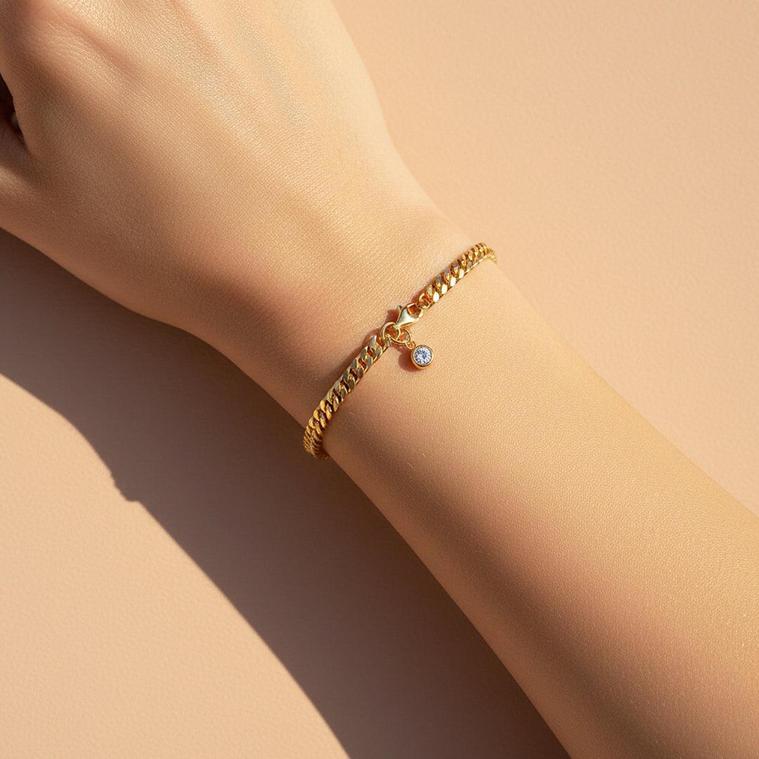 Prm9155 – Glow Drop is a bold expression of modern luxury with a refined twist. Featuring a sleek, polished chain finished in radiant gold tone, this bracelet is elevated by a delicate 0.3 carat moissanite charm that catches the light with every movement. The D Colour, VVS1 clarity stone delivers diamond-like fire and brilliance, creating a subtle yet captivating sparkle that feels effortlessly chic and contemporary.