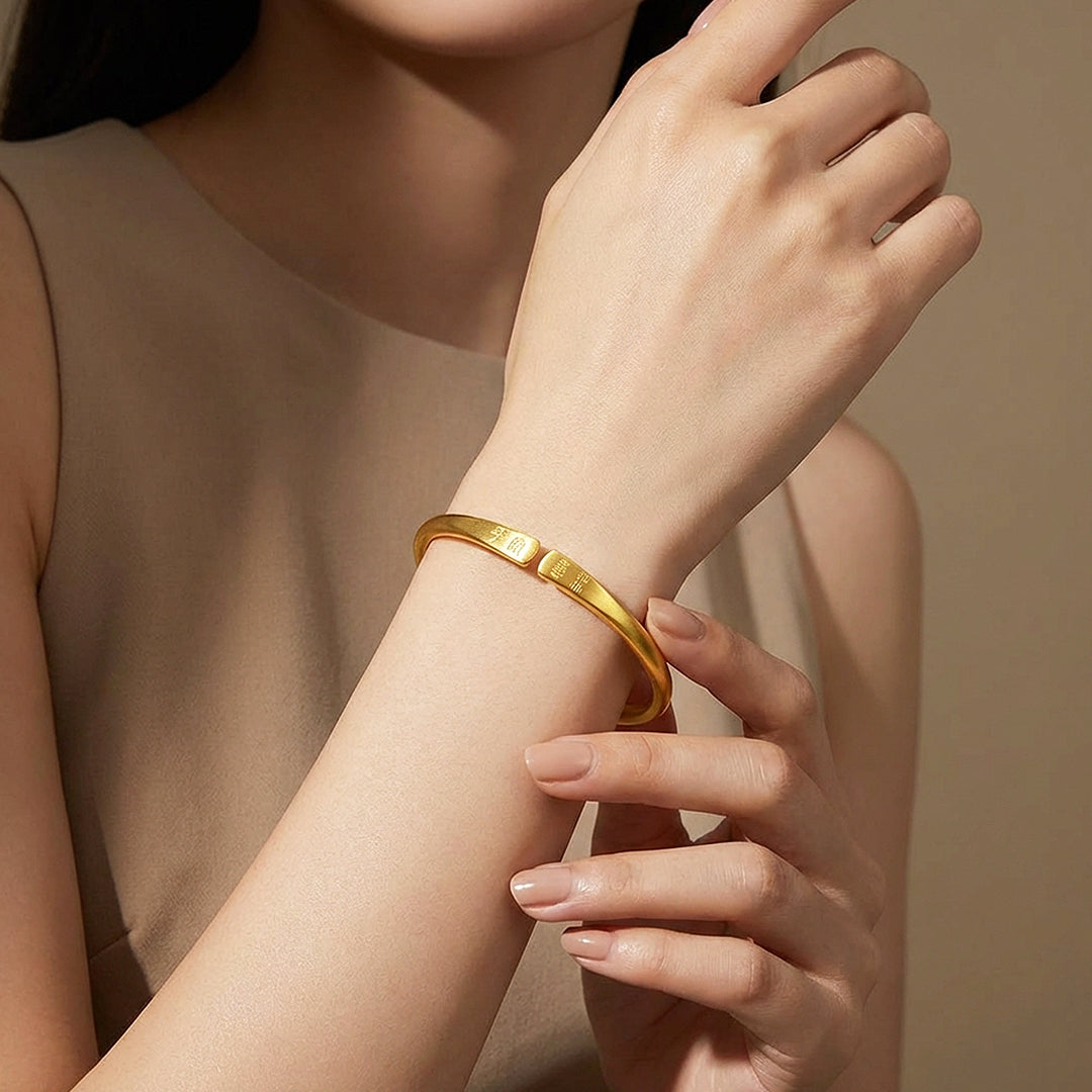 Some gold bangles are worn for how they look. This one is worn for what it means. The Luxe6543 is a smooth, rounded open cuff bangle finished in a warm matte brushed gold, with traditional Chinese characters for peace — 平安 — and joy — 喜乐 — precision-engraved on each end. A meaningful gold bangle bracelet that works as beautifully as an everyday luxury bangle as it does a thoughtful gift. Wear it as a quiet intention on the wrist, every single day.