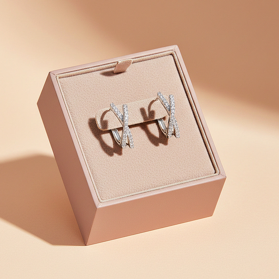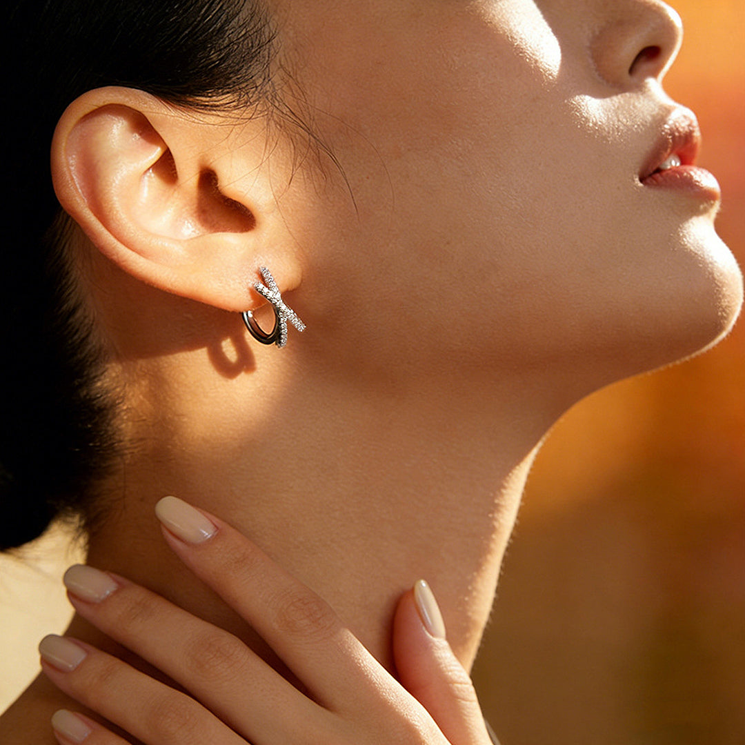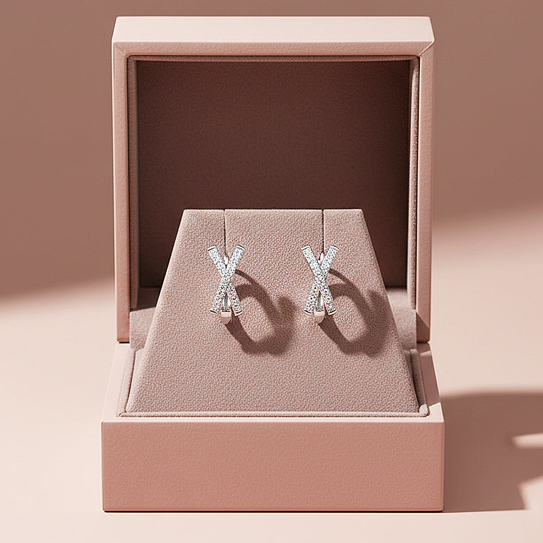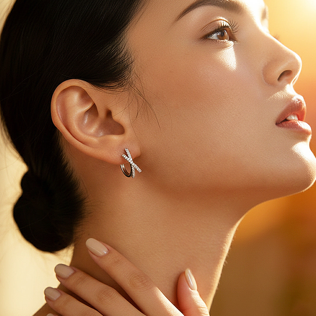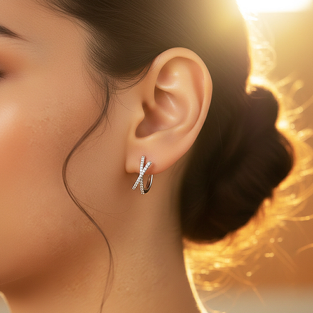 Introducing Prm8134 – Diamond Embrace, a refined statement of modern elegance crafted for those who appreciate brilliance in its purest form. The distinctive crossed silhouette is delicately paved with Premium Moissanite stones, each graded D colour and VVS1 clarity, creating a seamless ribbon of light that curves gracefully along the ear. The intersecting design symbolizes harmony and strength, while the precise setting ensures uninterrupted sparkle from every angle.