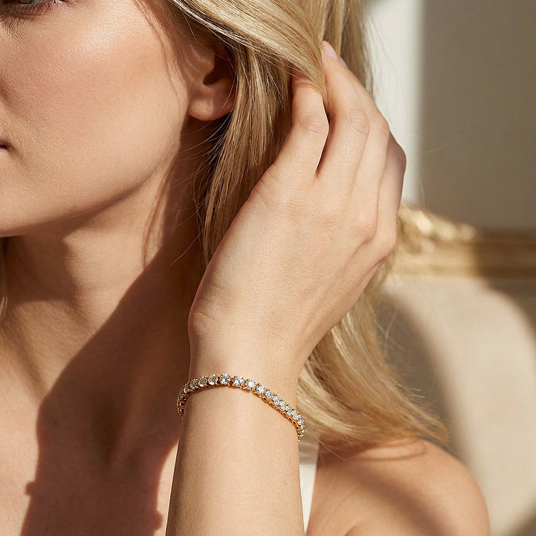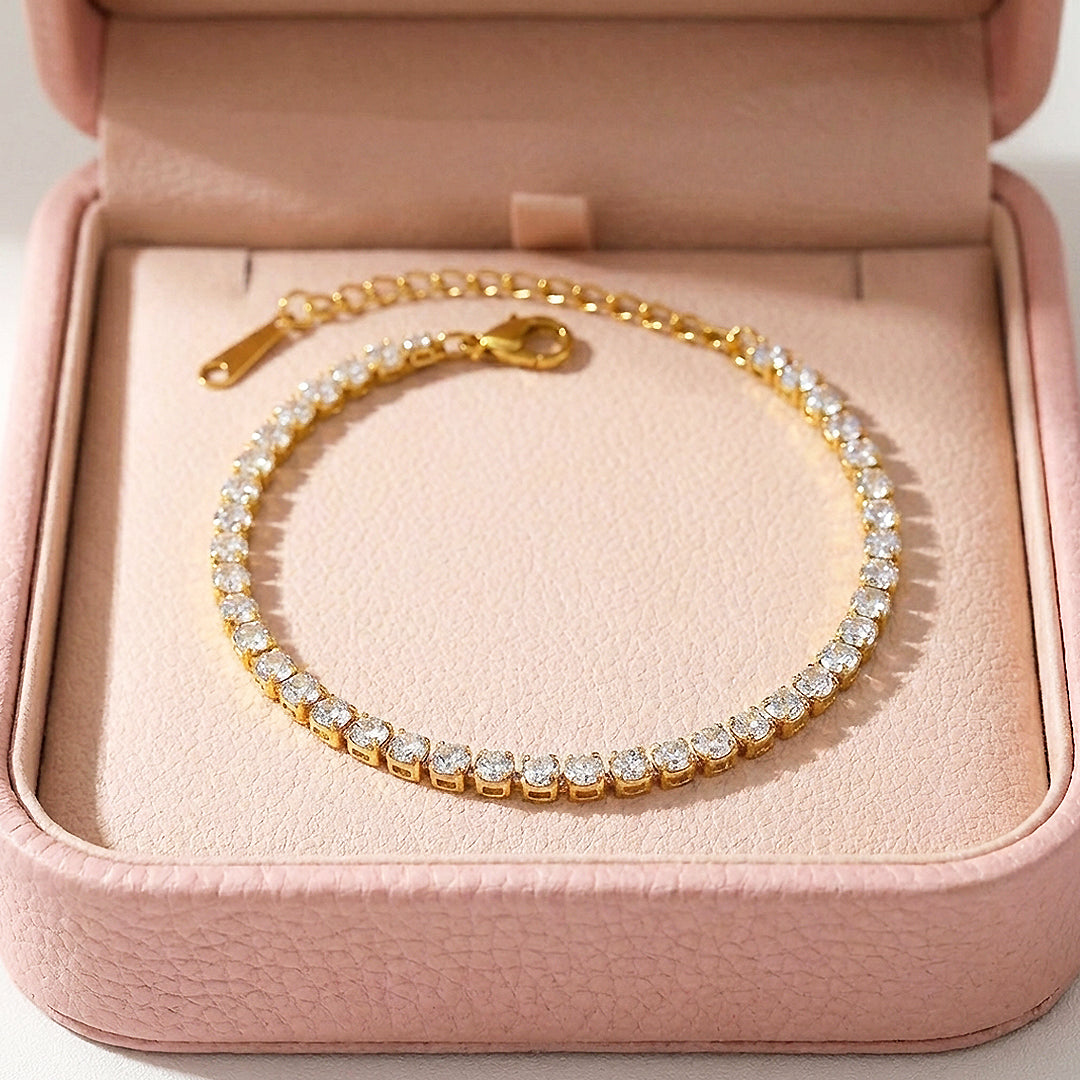 The tennis bracelet is a timeless format — and this one earns its place in the category. A continuous row of prong-set, round diamond simulant stones runs the full length of the bracelet, each one sitting flush and bright against the gold setting. It's the kind of piece that photographs beautifully and wears even better — understated at a glance, undeniably brilliant up close. Tarnish-free, waterproof, and adjustable, it transitions effortlessly from desk to dinner without missing a beat.