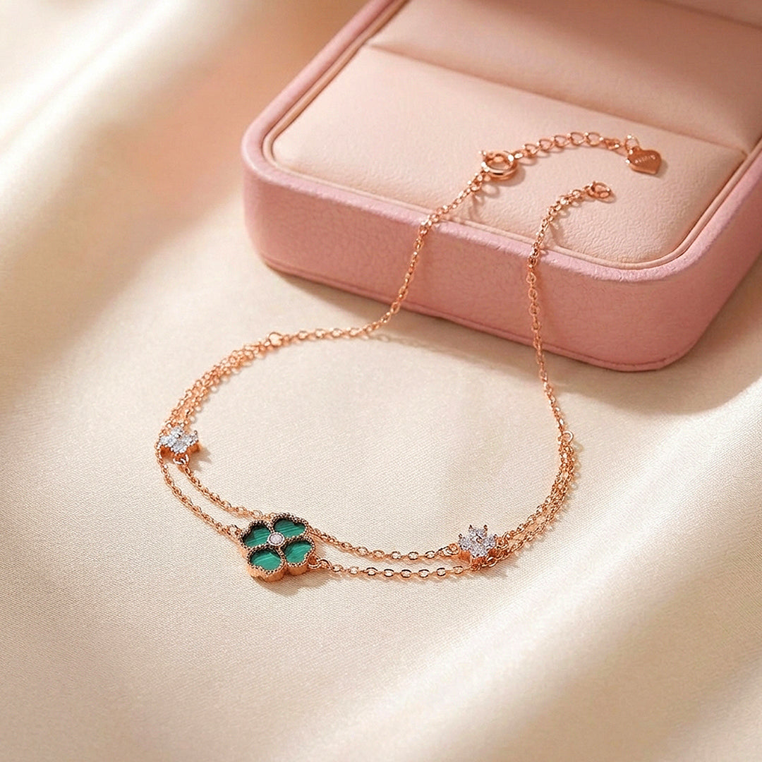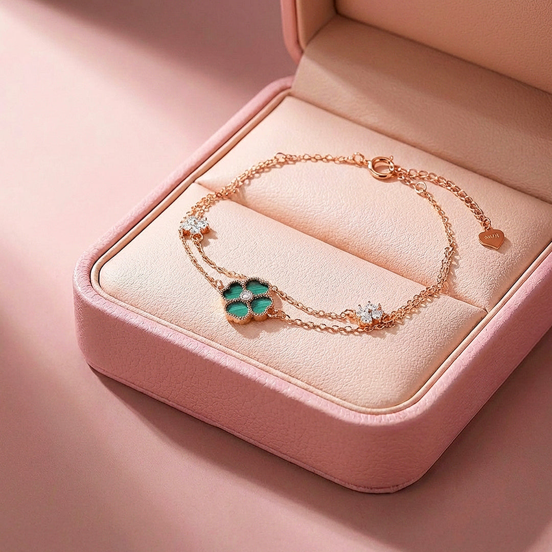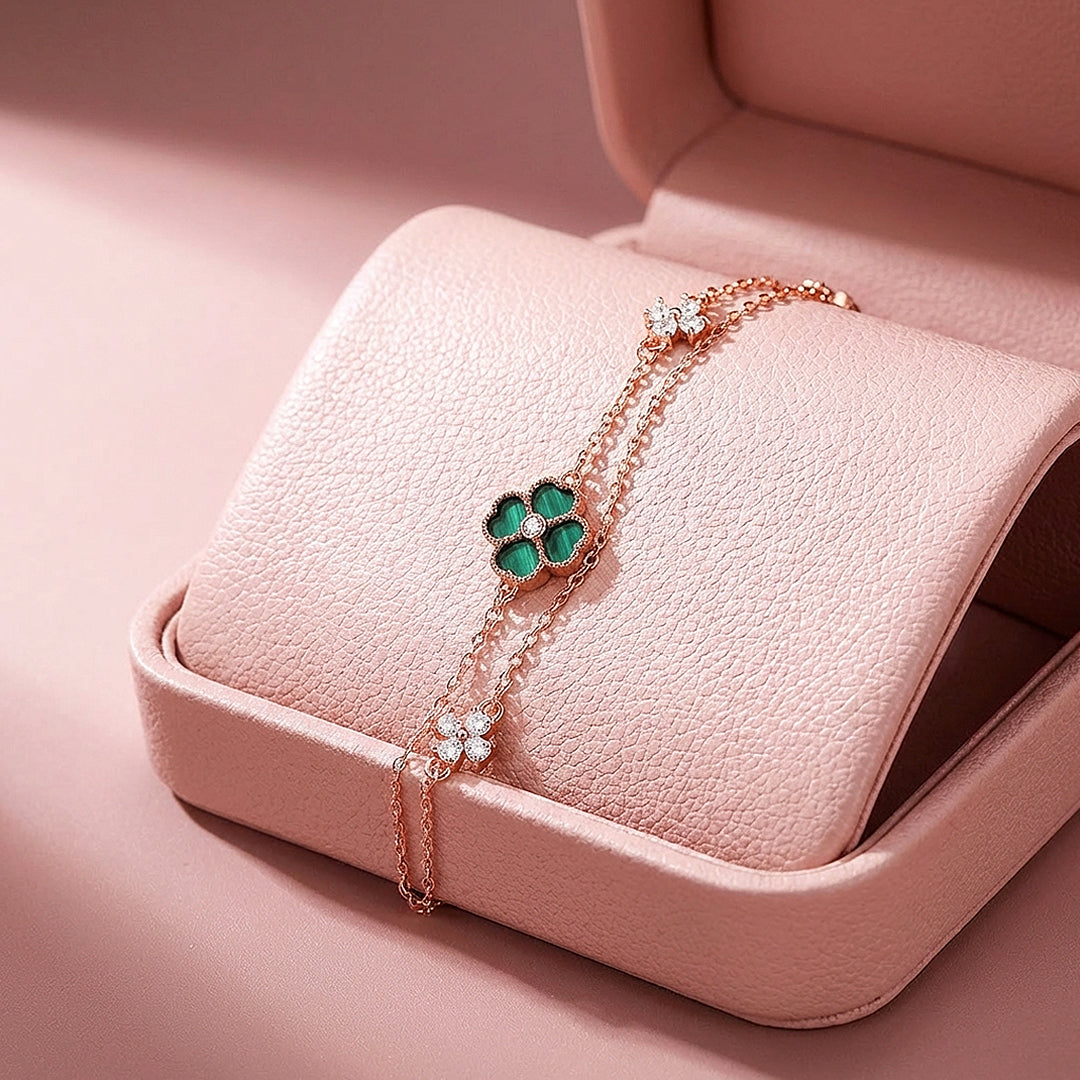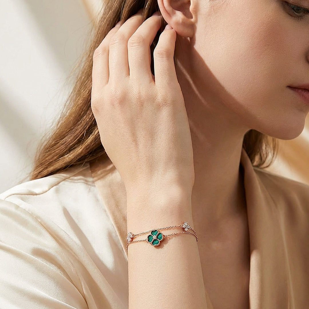 A rose gold bracelet with genuine colour and character. The centrepiece is a four-panel clover inlaid with deep green malachite simulant — its rich, natural-looking swirls framed in a milgrain rose gold border with a single Diamond Simulant at the centre. Two smaller pavé Diamond Simulant clover accents sit on either side along the double chain, adding sparkle that complements rather than competes. The green and rose gold combination is bold enough to stand out and refined enough to wear anywhere. Crafted from Premium Titanium Steel with five layers of 18K rose gold electroplating.
