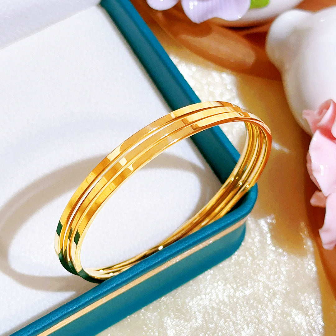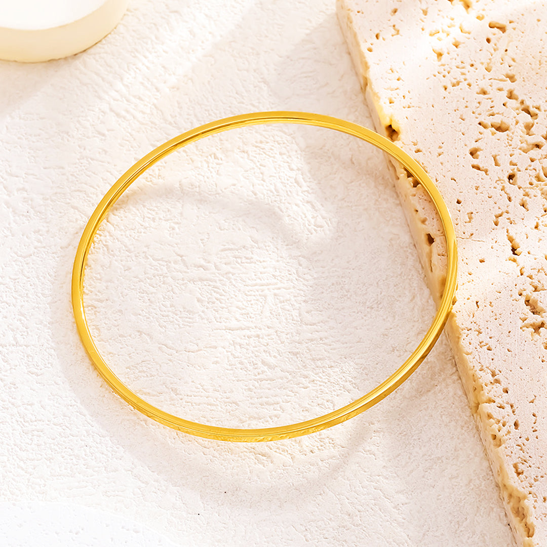 Timeless, refined, and effortlessly luxurious, the Luxe6498 Bangle is a staple piece every elegant wardrobe deserves. Crafted from high-strength titanium steel and finished in radiant gold plating, this bangle features a sleek, ultra-slim profile that exudes minimalist sophistication. Its smooth, mirror-like finish catches the light beautifully, adding a touch of golden elegance whether worn alone or paired with other pieces.