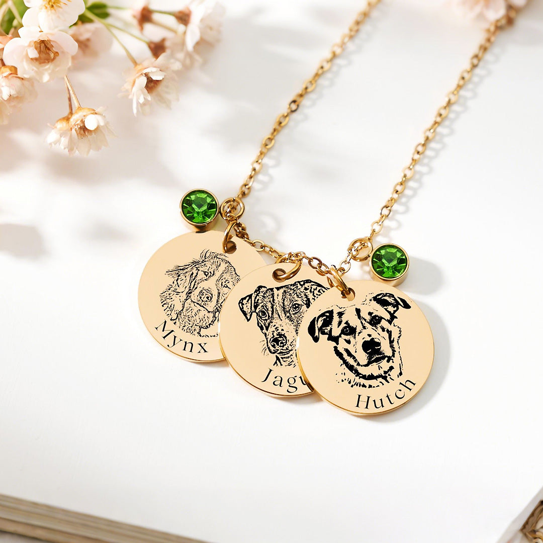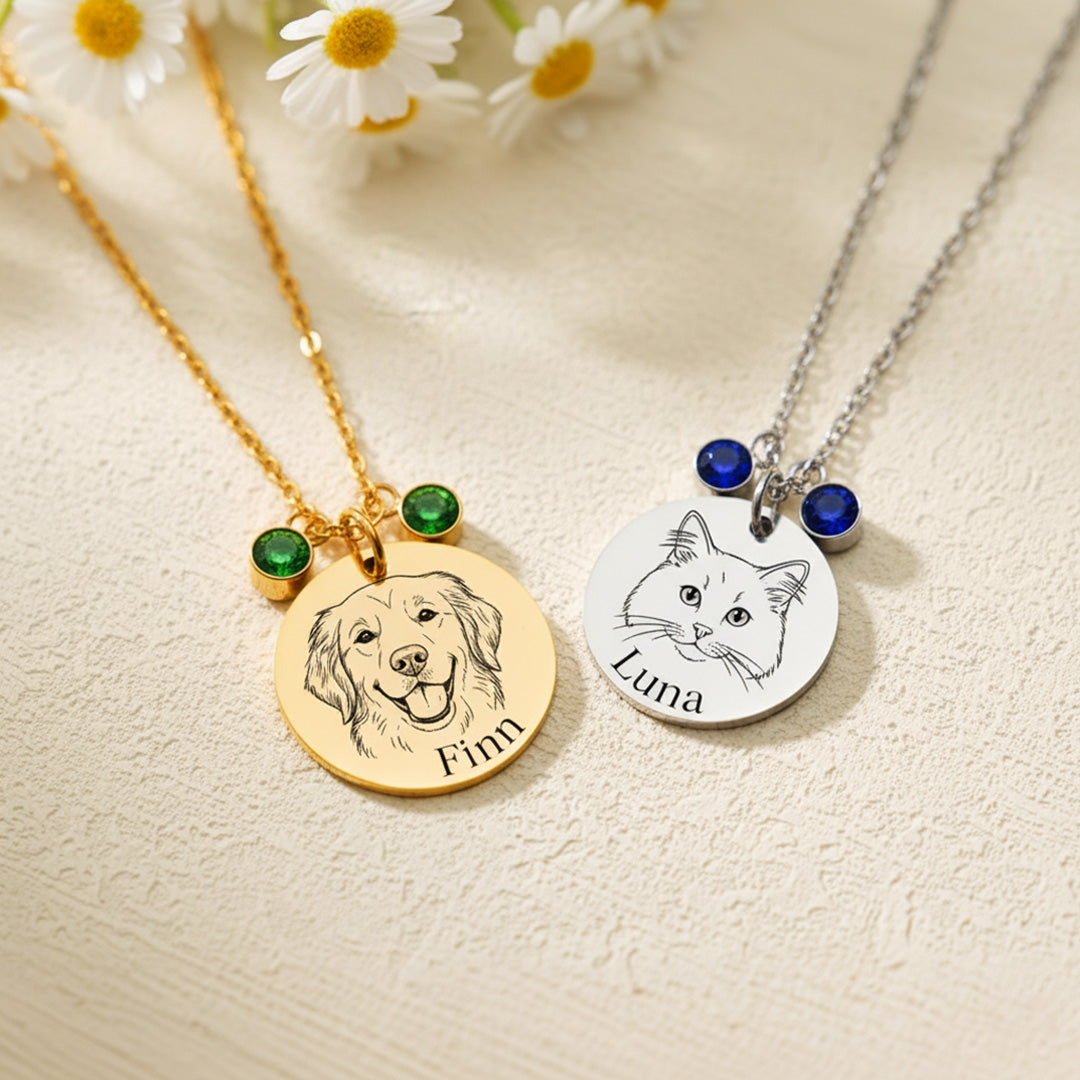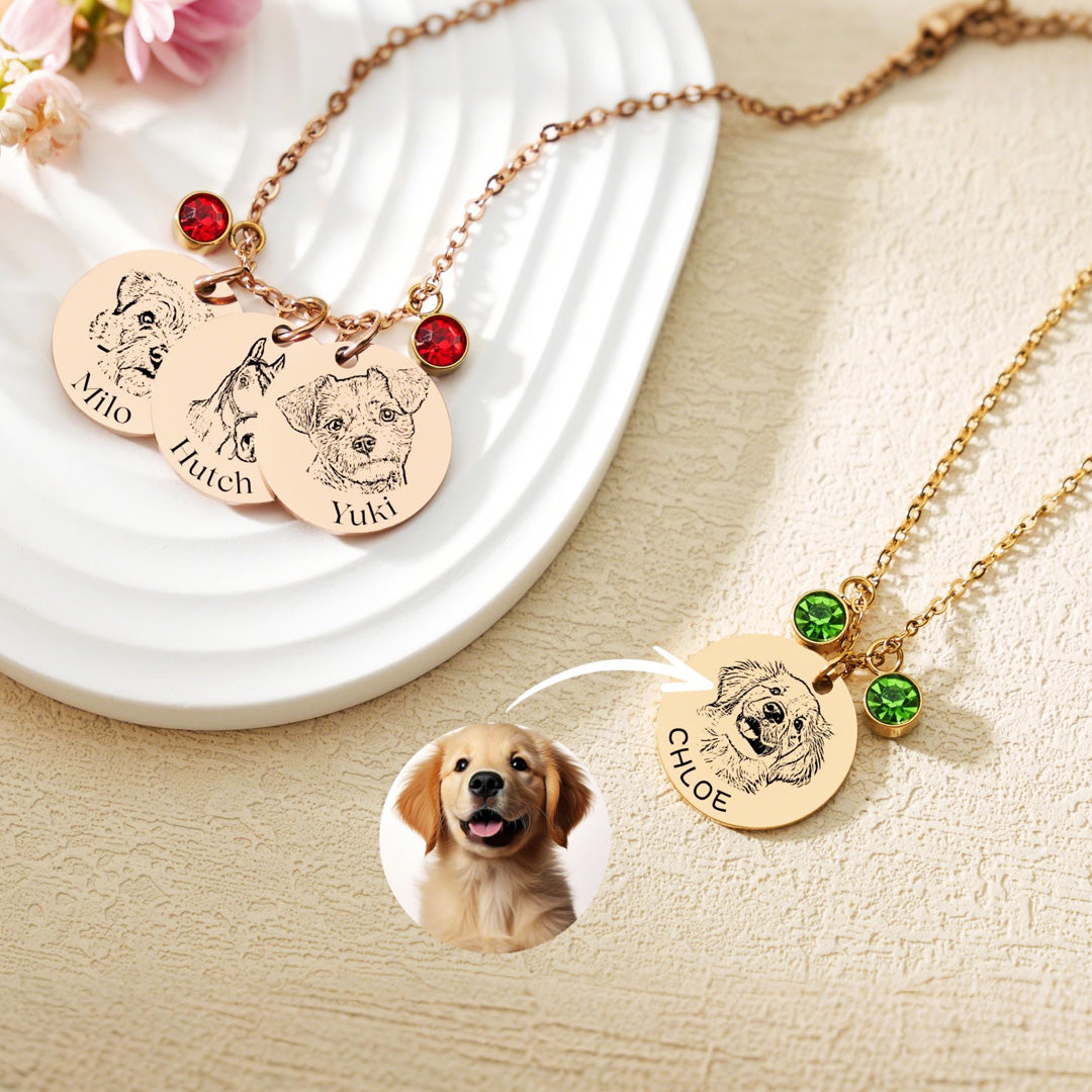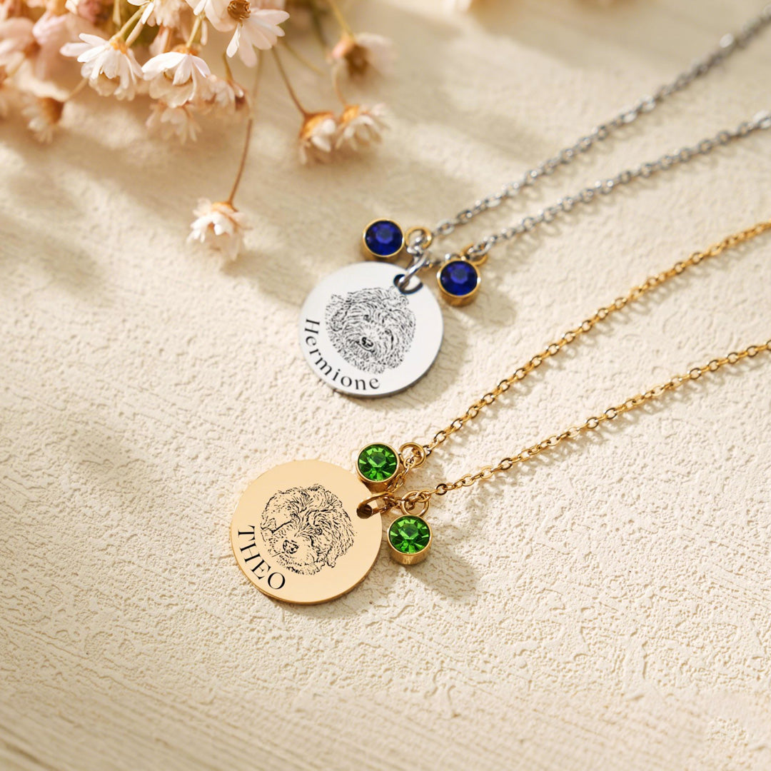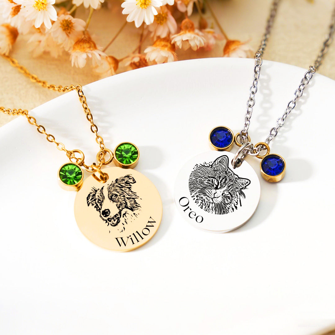 The centerpiece of this necklace is a circular pendant, beautifully engraved with a detailed portrait of your pet from a photo you provide. Below the portrait, your pet's name is elegantly inscribed, creating a truly personalized keepsake. Each pendant also comes adorned with a sparkling birthstone of your choice, adding an extra touch of individuality and meaning.