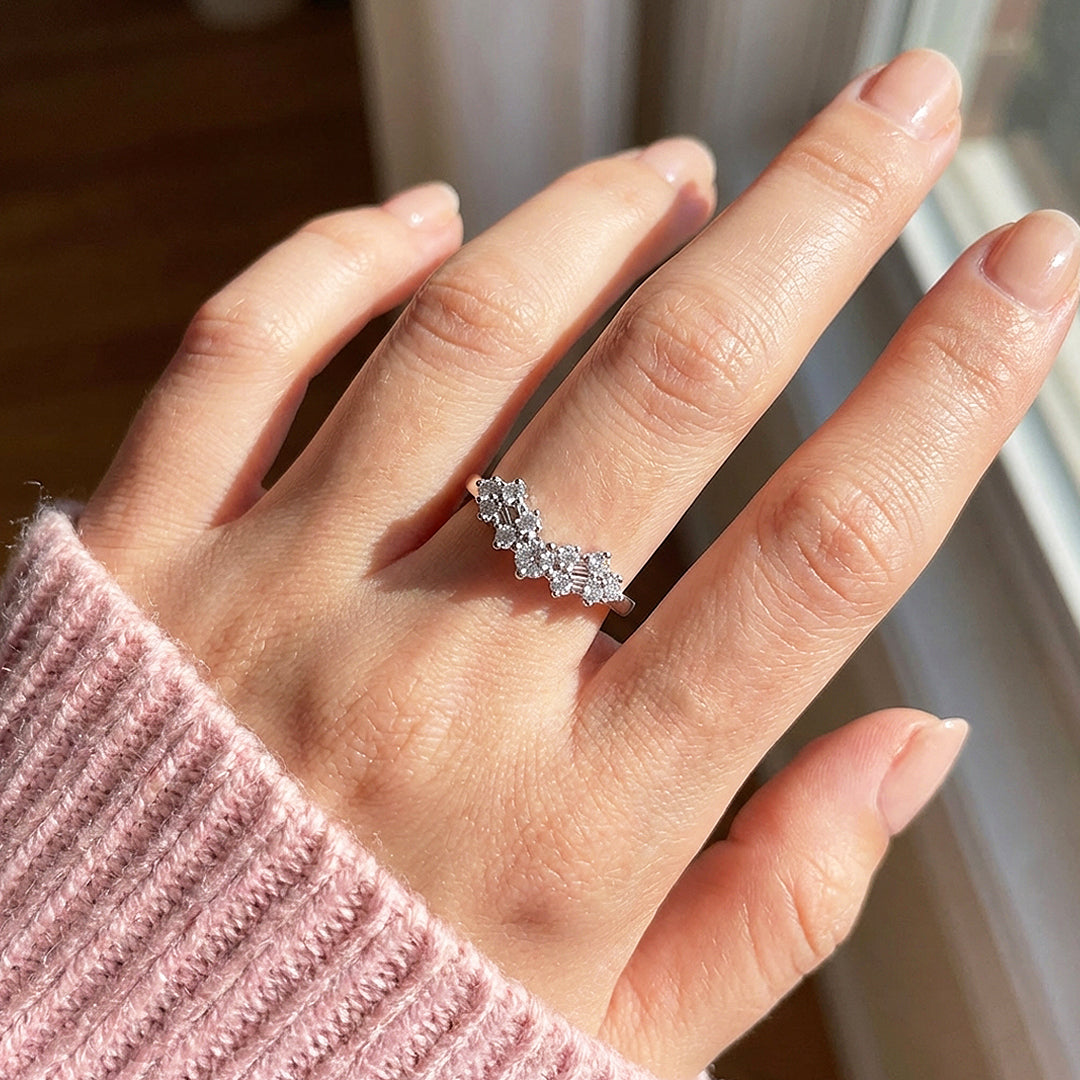 • Diamond Simulant pavé set along both curving arms of the band