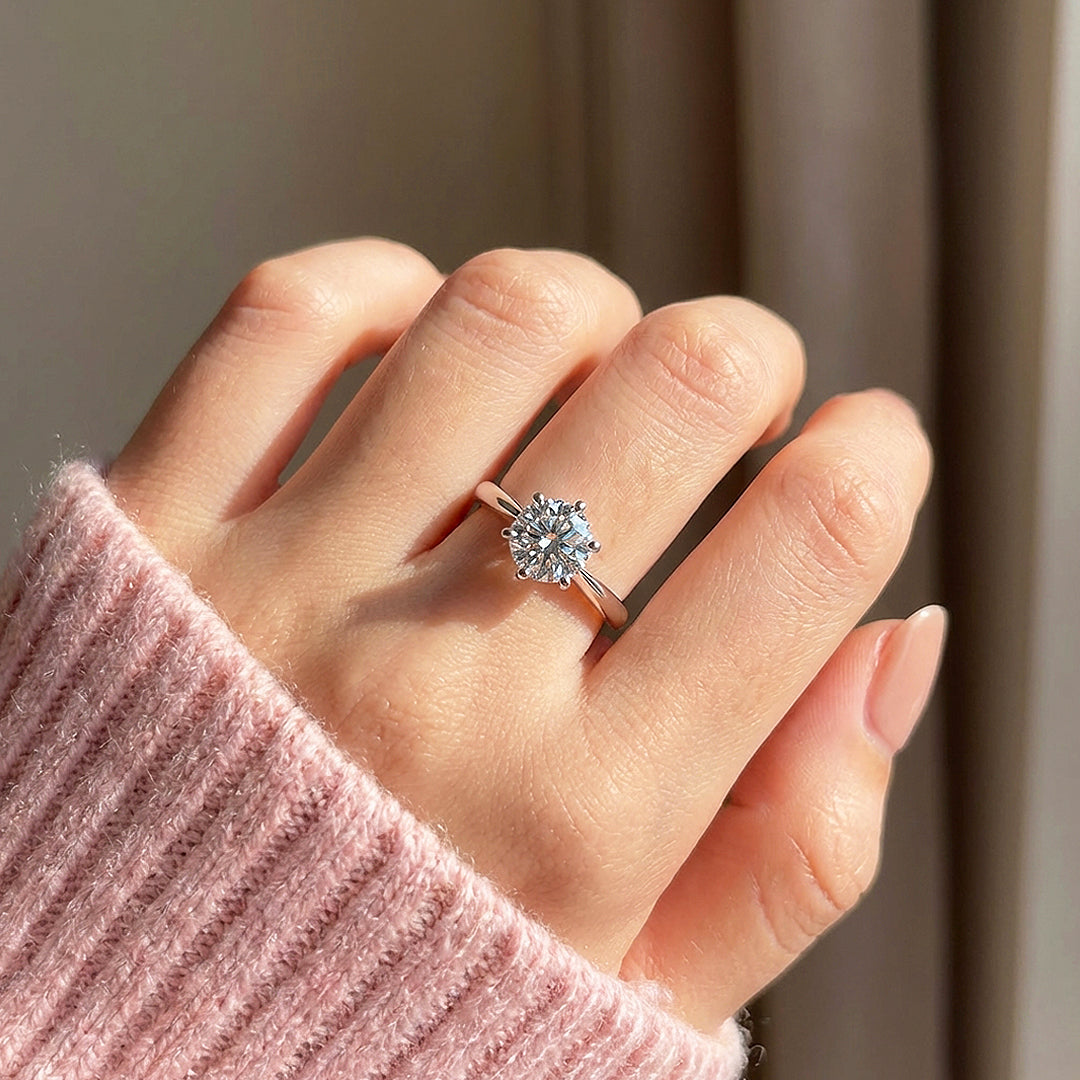 PRM7144 is the solitaire in its most enduring form — a round brilliant Moissanite in a six-prong setting on a plain polished band, with nothing added and nothing missing. Available in 0.5ct, 1ct, or 2ct, the design scales cleanly at every size without losing its proportion or its quiet authority. D Colour, VVS1 Clarity Moissanite at this level of simplicity has nowhere to hide — which is precisely why it works. The ring you come back to when everything else feels like too much.