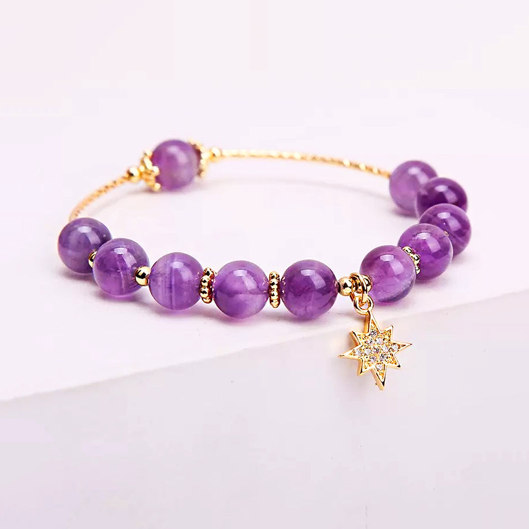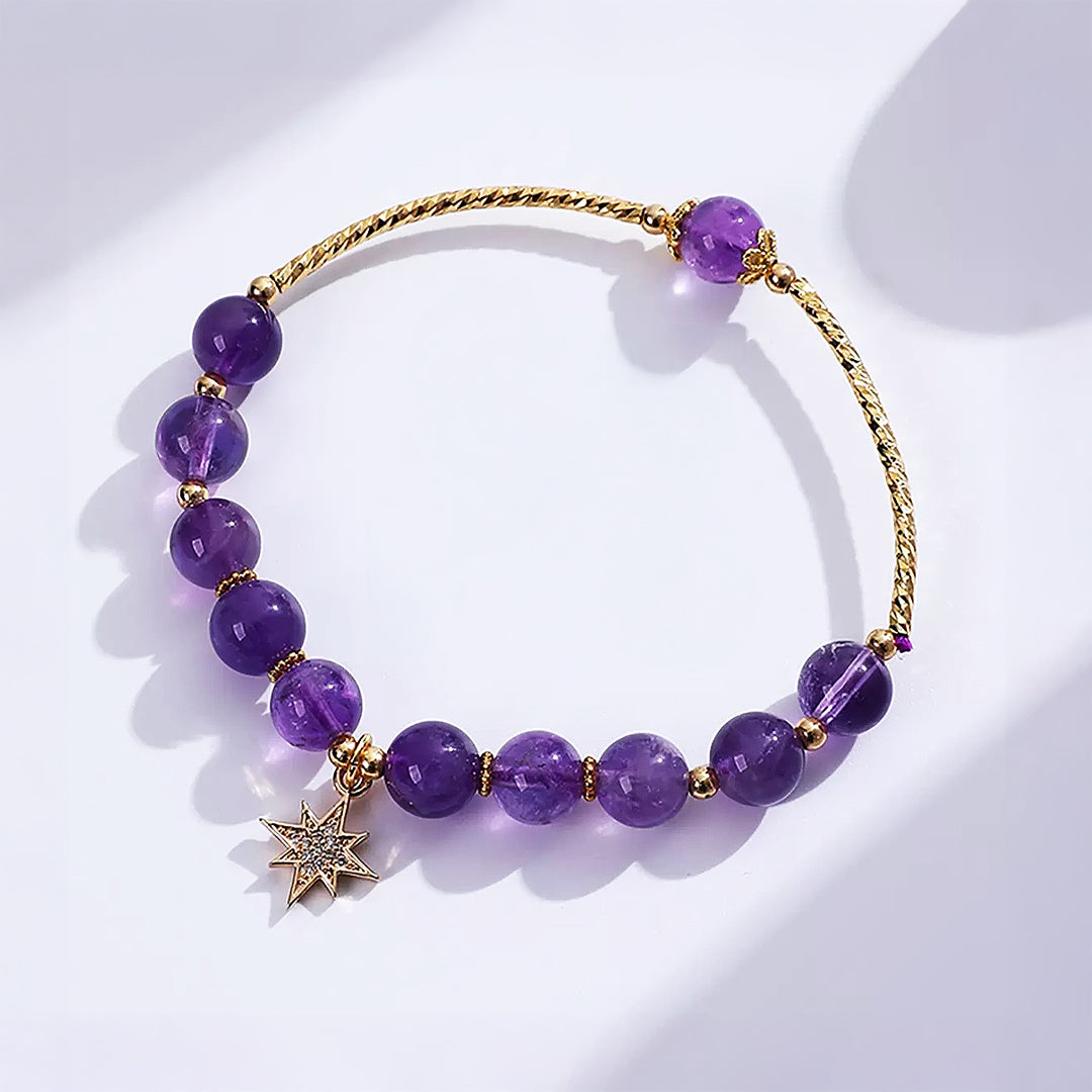 The bracelet's enchanting focal point is a dazzling gold-tone star charm, intricately pavé-set with sparkling cubic zirconia stones. This brilliant star dangles gracefully, catching the light and adding a touch of celestial magic and sophisticated shimmer. The combination of the tranquil Amethyst and the radiant star creates a piece that is both calming and inspiring.