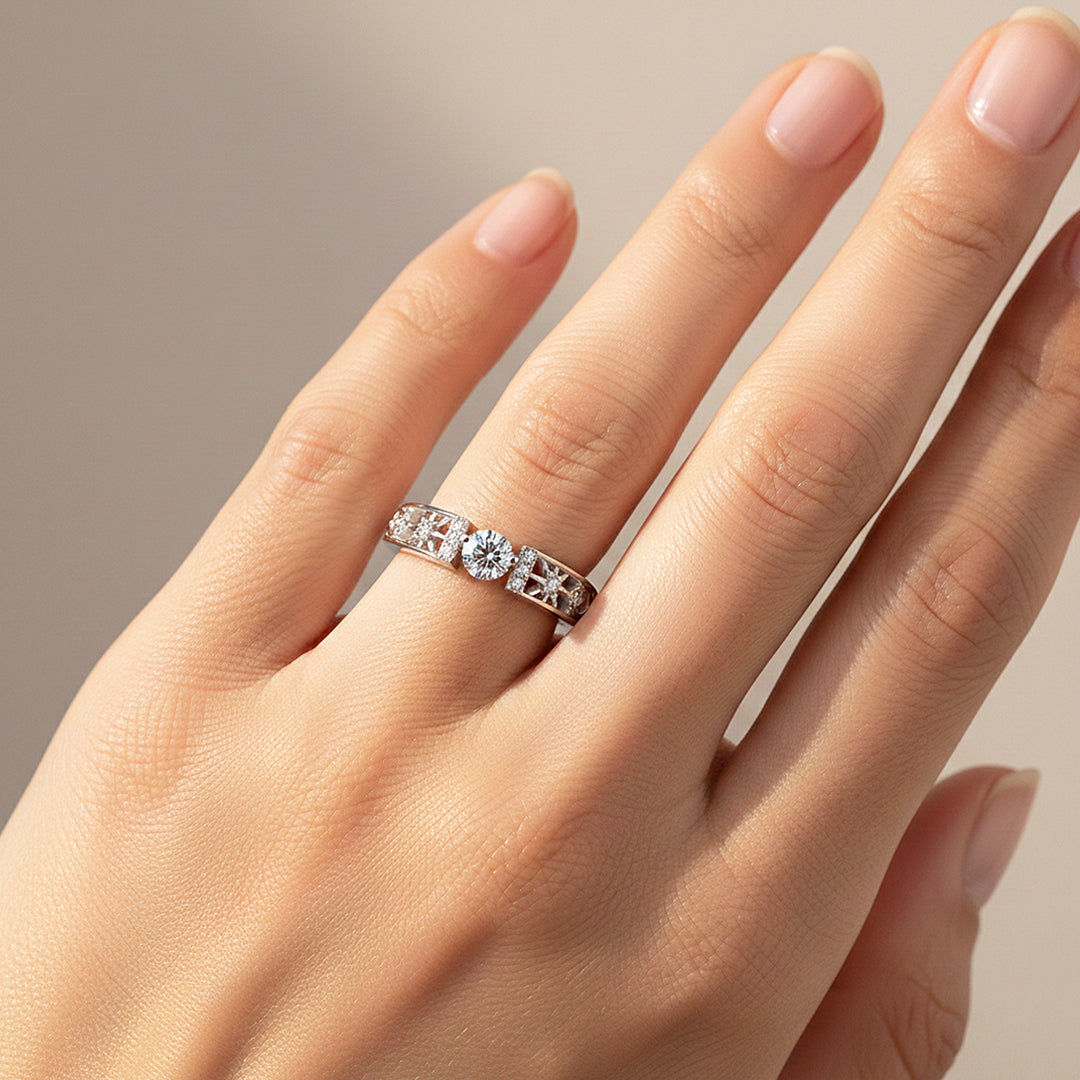 This openwork design allows light to stream through, enhancing the ring's overall radiance and creating a dynamic contrast between the bold, central solitaire and the delicate, starry band. Crafted from luminous 925 Sterling Silver, this ring is an irresistibly unique and luxurious statement, guaranteed to become a cherished, daily reminder of your own brilliant light and sophisticated style.