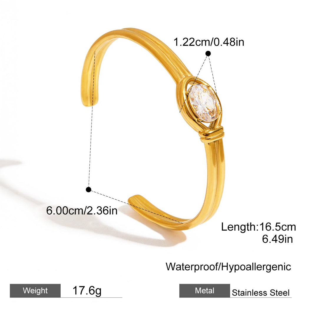 Bold yet refined, the Luxe6482 Radiant Oval Luxe Bangle is crafted to make an effortless statement. Featuring a sculpted double-band design finished in radiant, non-tarnish gold, this piece is centred with a sparkling oval-cut cubic zirconia that catches the light with every gesture. Hypoallergenic and waterproof, it’s designed for everyday luxury that lasts.