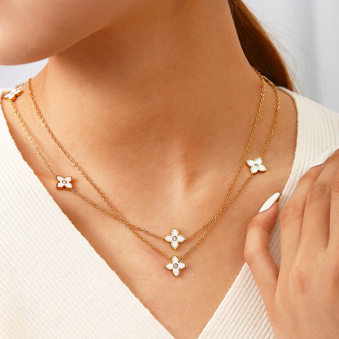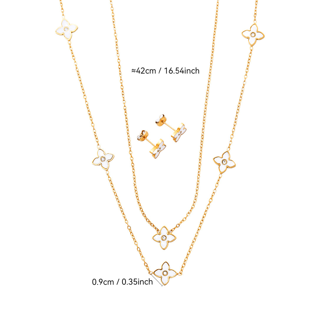 Adorn yourself in the exquisite, timeless elegance of the Luxe4424 Golden Clover Elegance Set. This stunning matching collection transforms the iconic clover motif into a luxurious, wearable work of art. Each clover features a luminous white enamel inlay, creating a striking contrast against the warm, rich Gold Plating that bathes the entire set. At the heart of every flower, a brilliant Simulant Diamond sparkles with concentrated, captivating fire. The necklace features a chic double-strand design, layering the charming clover stations beautifully along the neckline. The matching stud earrings provide a perfect, dazzling accent.
