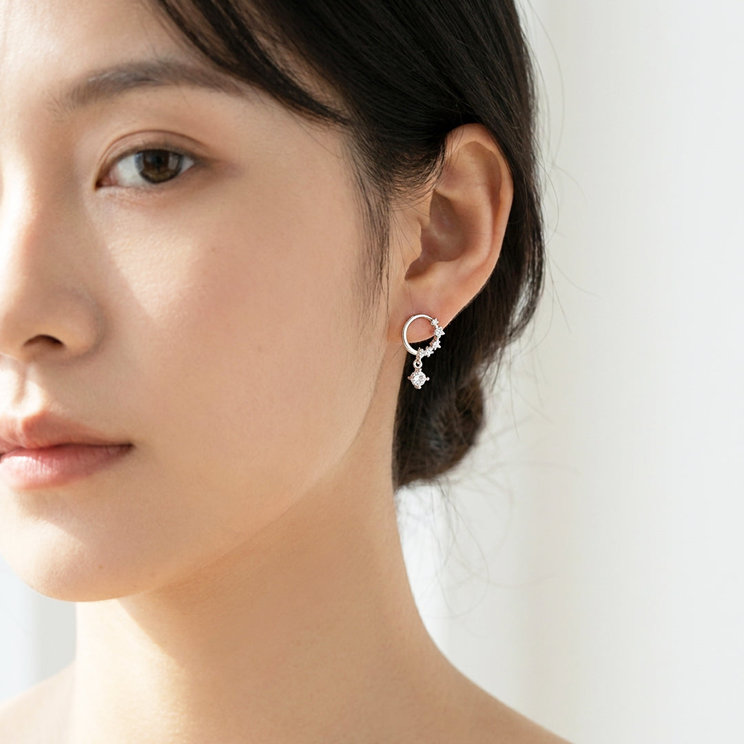 The Luxe2989 Earrings are the kind of design that rewards a closer look. An open circular hoop, its lower arc set with graduated Diamond Simulant pavé, anchors the piece at the lobe — from which a clean silver bar descends, ending in a single prong-set Diamond Simulant solitaire that catches light with every movement. The contrast between the sparkle of the hoop and the bare simplicity of the bar is deliberate and effective. These are the earrings that add length and drama to an outfit without overwhelming it.