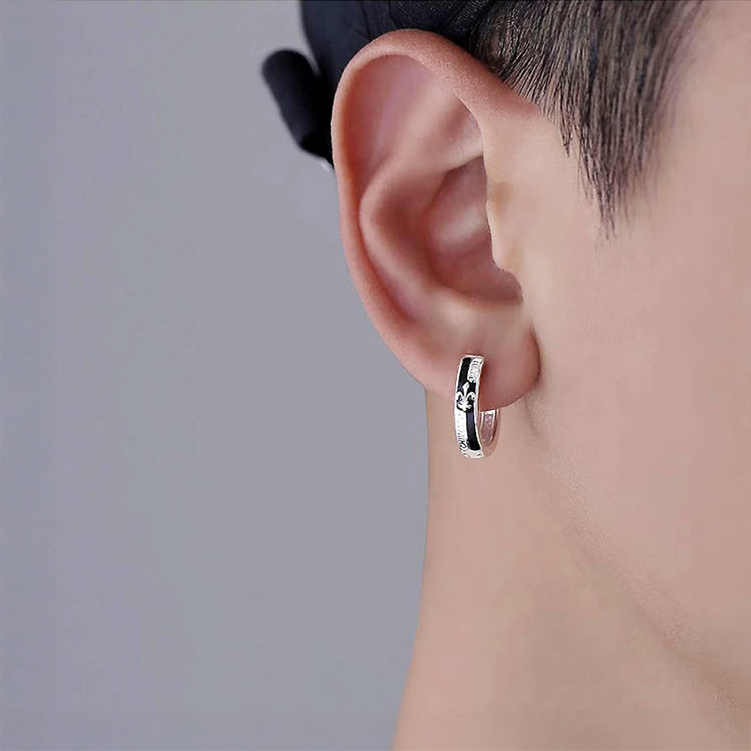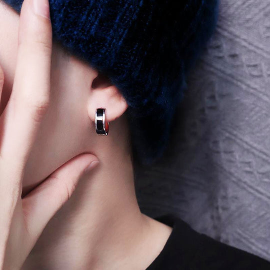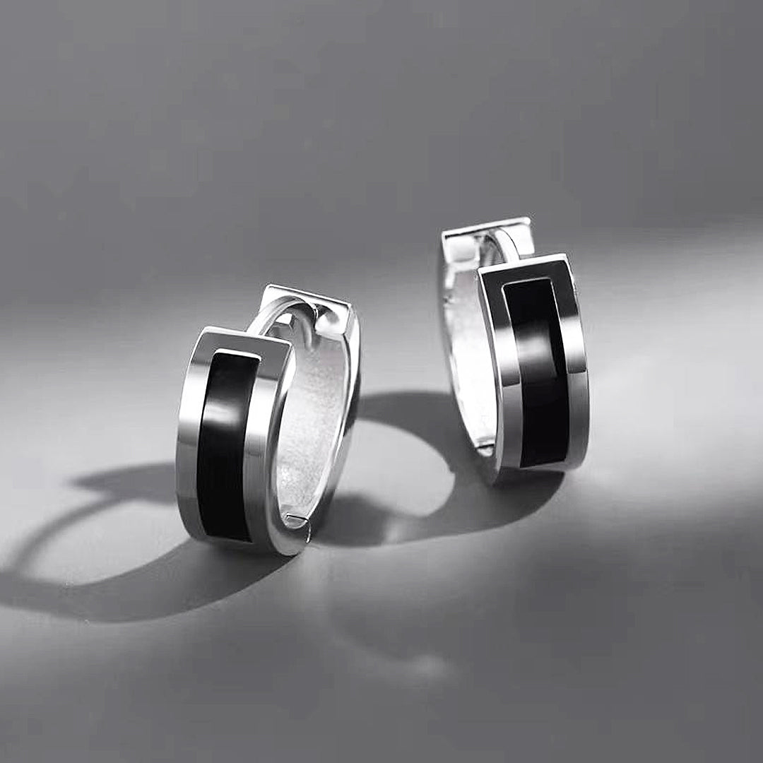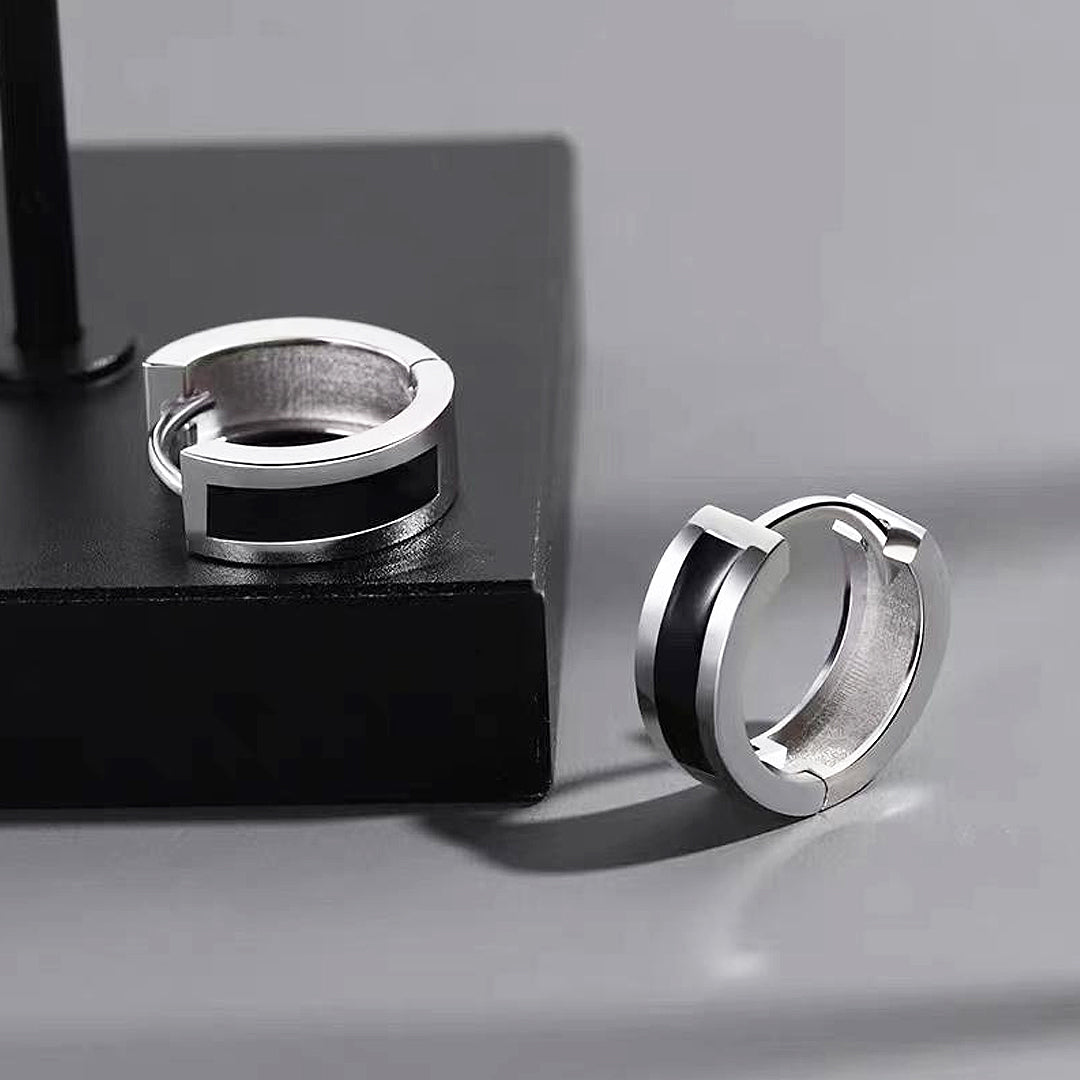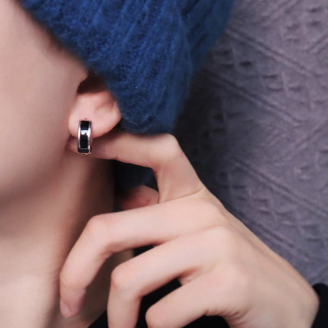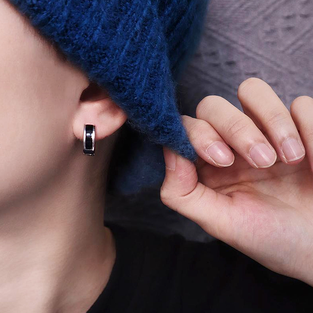 The ME1010 features a contemporary mini hoop design with a clean, streamlined aesthetic. Each hoop is enhanced by a prominent rectangular black inlay that runs across the front, creating a powerful visual contrast against the polished silver-tone titanium steel. This minimalist yet bold detail gives these hoops a distinctly modern and refined appeal, making them a versatile choice for any occasion. The subtle gleam of the metal paired with the deep, rich black inlay exudes understated confidence.