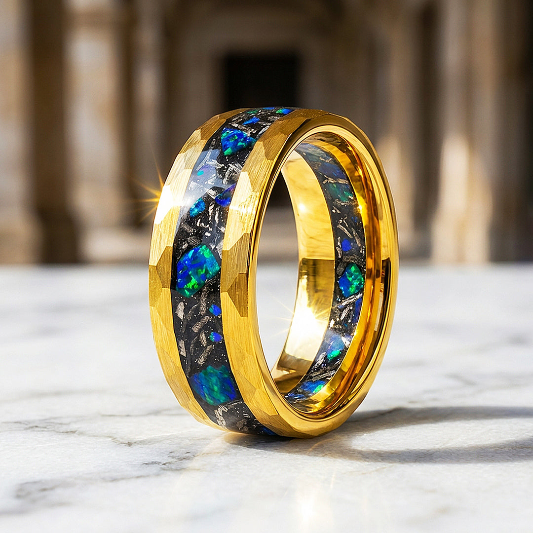 Aureus Opal Hammered Gold Opal Inlay Tungsten Carbide Ring