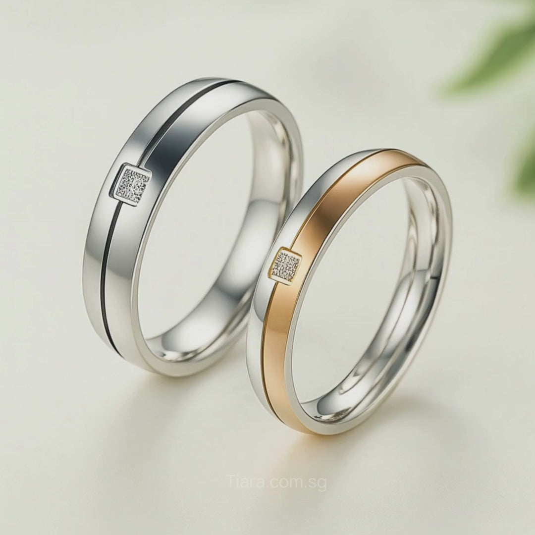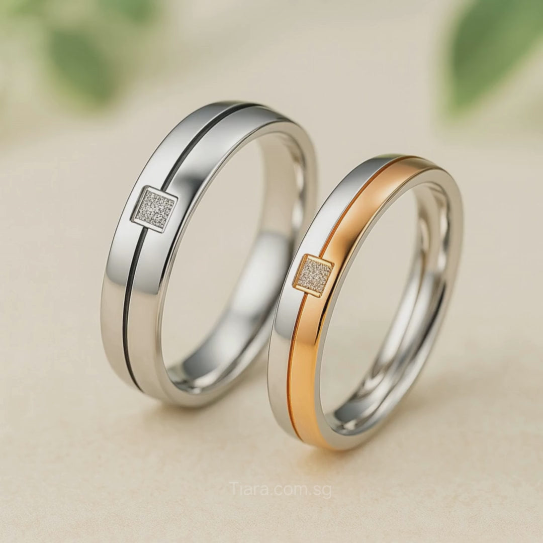 Both rings share a refined, square centerpiece—a delicate patch of pavé-set zirconia that provides a brilliant, concentrated sparkle. Crafted from resilient Titanium Steel and sealed with a premium five-layer electroplating, these rings are built for a lifetime of comfort and wear. The sophisticated blend of texture, color, and sparkle creates an irresistibly chic statement of commitment and enduring, effortless luxury.