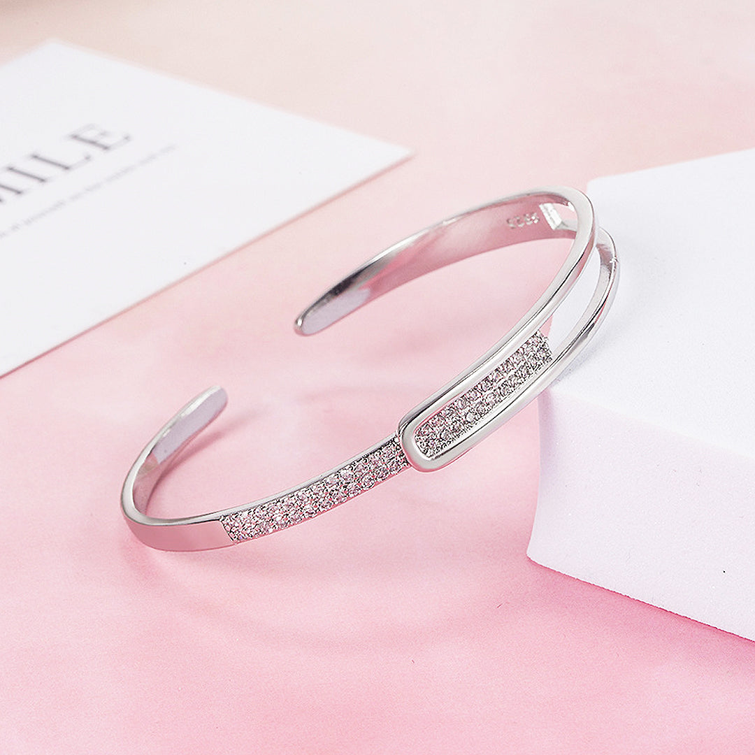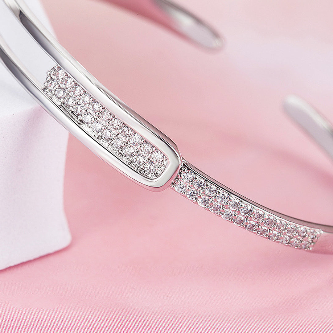 The Luxe6125 Radiant Dual-Bar Cuff embodies modern sophistication with a luminous, high-jewellery finish. Crafted with a sleek open-ended silhouette, this cuff features two elegant parallel bars that gracefully frame a centrepiece of meticulously set top-grade simulant diamonds. The stones shimmer with a diamond-like radiance, catching every glimmer of light for a look that is striking yet effortlessly refined.